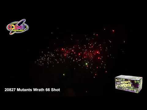 Cosmic fireworksA 66 shot cake ejecting an assorted coloured tails which burst golden coco effects with purple or green stars, red plum blossom effects with eithe...