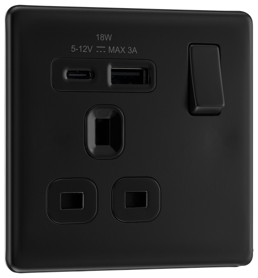 View full detailsBG Electrical Flatplate Screwless Matt Black - Single, switched, single pole, with 1 x USB A + 1 x USB C
