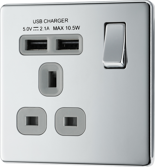 View full detailsBG Electrical Flatplate Screwless Polished Chrome - Single, switched, single pole, with 1 x USB A + 1 x USB C