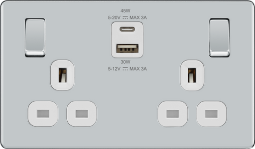 View full detailsBG Electrical Flatplate Screwless Polished Chrome - Double switched single pole, with USB A + C (22W)
