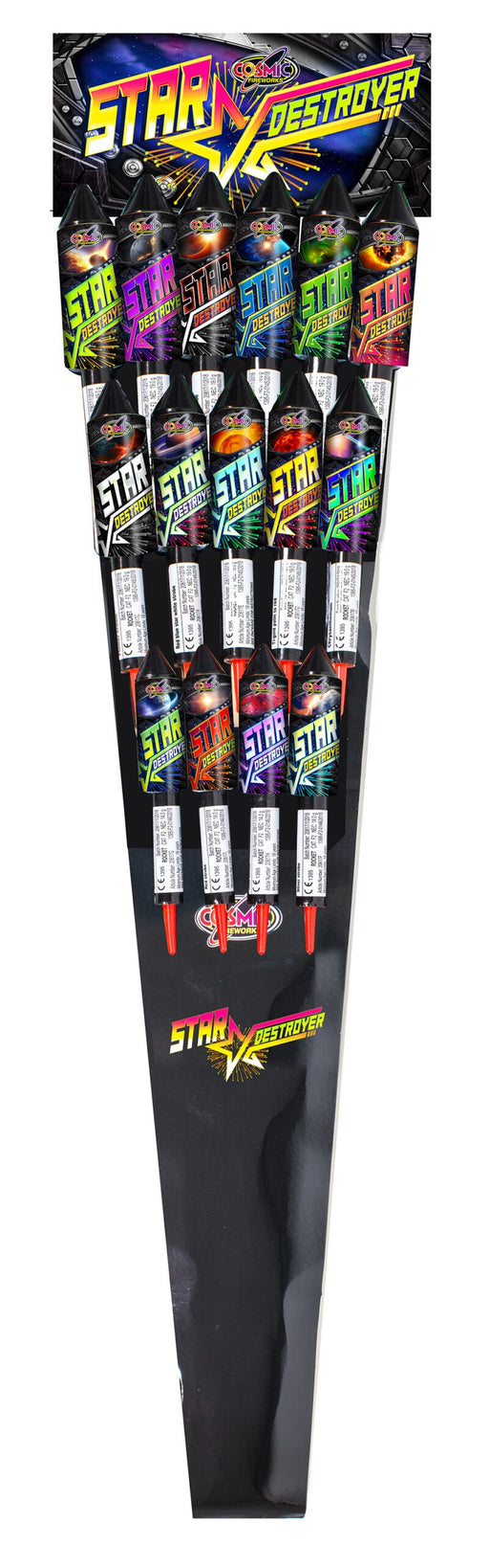 Cosmic fireworksA pack of 21 rockets with bursts which include assorted coloured strobe effects with coloured star, assorted palms with crackling stars and colour...
