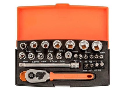 The Bahco SL25 is a handy 1/4in drive socket set complete with 12 sockets made from hardened chrome vanadium, a bit set with a dynamic drive profile and a quick-release ratchet. Ideal for the home, garage or car, this Bahco SL25 socket set will give years of service as it is made from a hard-wearing steel material. The set has all the most common sized sockets, so the set is well equipped to tackle any job in or around the home. It is especially suitable for the motor trade.