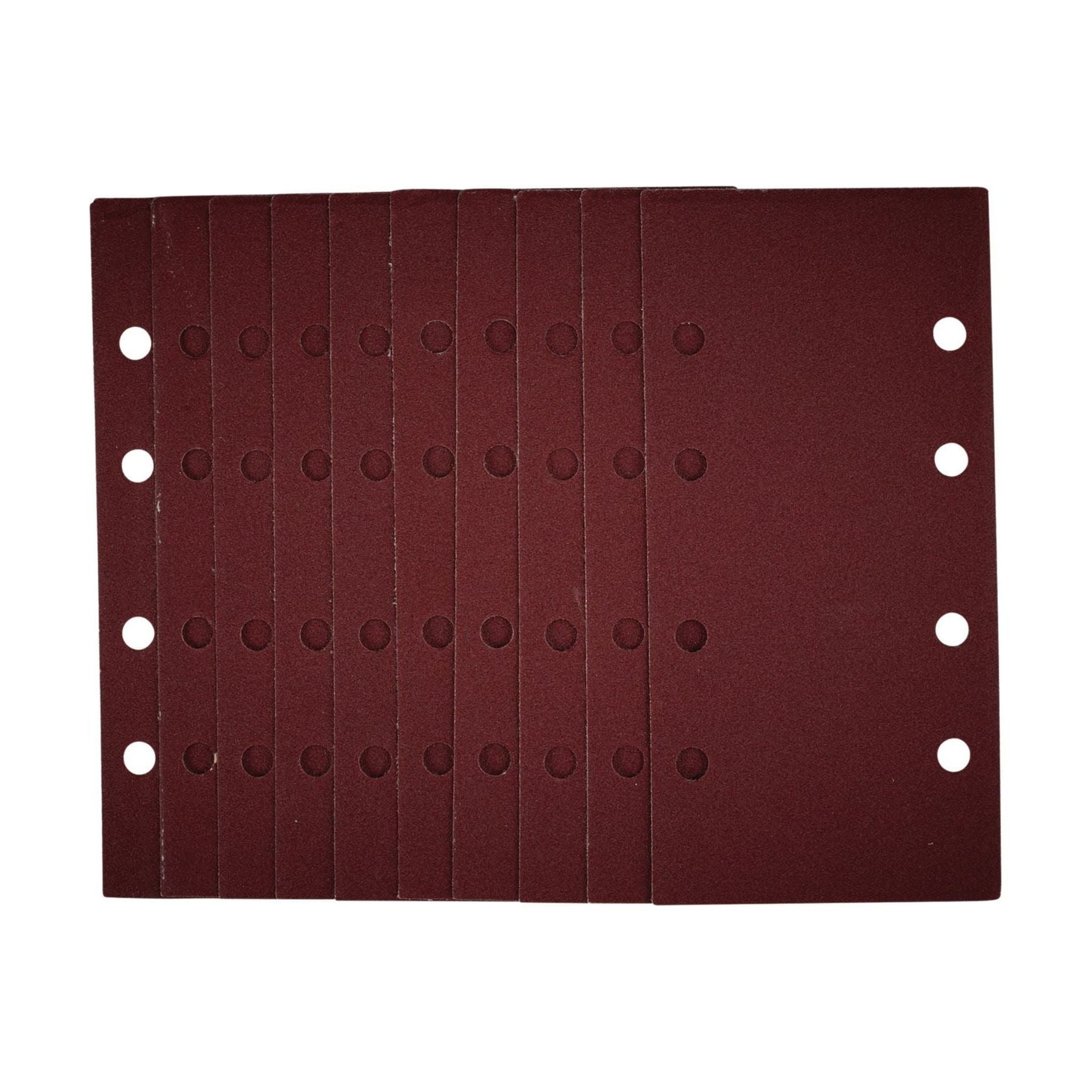 This pack of 1/3 sanding sheets (93 x 190mm) are made from premium quality aluminium oxide that is resin bonded to provide improved grain adhesion, anti-static qualities and long-lasting performance. The heavy-duty E-Weight backing paper makes the sanding sheet more durable - able to withstand the toughest jobs. The hook and loop backing offers decent adhesion to facilitate the fast changing of sanding sheets. The eight pre-punched 8mm holes improve dust extraction. Ideal for sanding and finishing wood, metal, aluminium alloy, painted surfaces, plastic and fillers. Compatible with most 1/3 sanders with hook and loop including Stock No. 57839.