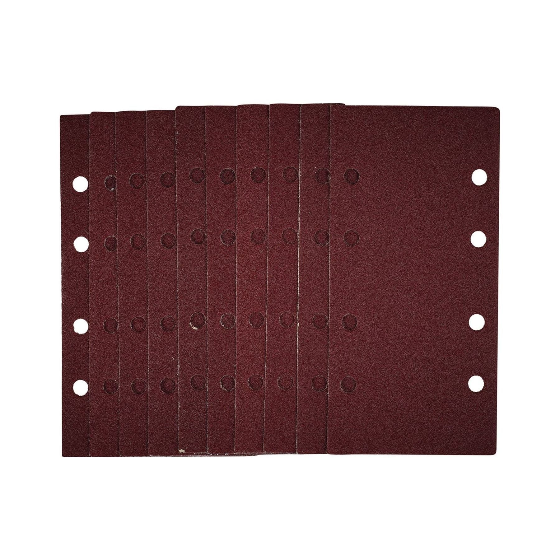This pack of 1/3 sanding sheets (93 x 190mm) are made from premium quality aluminium oxide that is resin bonded to provide improved grain adhesion, anti-static qualities and long-lasting performance. The heavy-duty E-Weight backing paper makes the sanding sheet more durable - able to withstand the toughest jobs. The hook and loop backing offers decent adhesion to facilitate the fast changing of sanding sheets. The eight pre-punched 8mm holes improve dust extraction. Ideal for sanding and finishing wood, metal, aluminium alloy, painted surfaces, plastic and fillers. Compatible with most 1/3 sanders with hook and loop including Stock No. 57839.