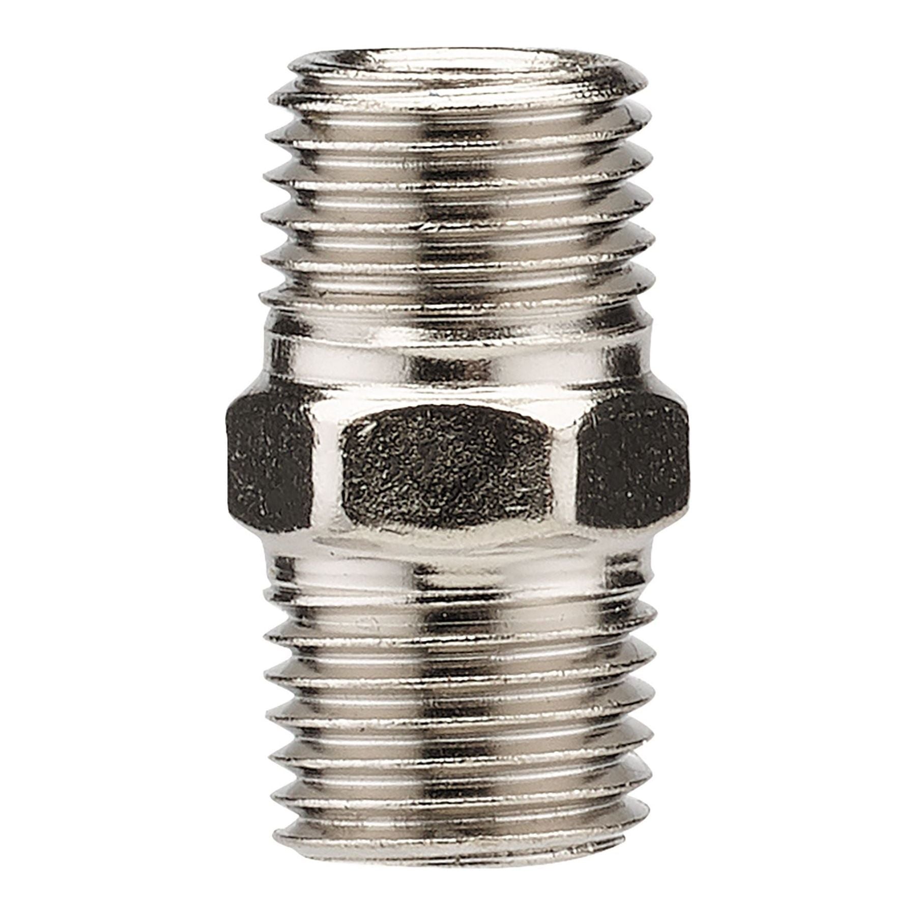 1/4" BSP male double union. Made from nickel plated steel.SpecificationsThread size: 1/4" BSPLength: 26mmHex size: 14 x 5.5mm