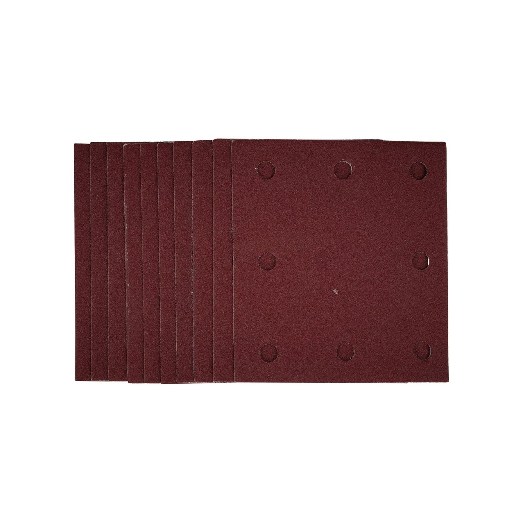 This pack of 1/4 sanding sheets (115 x 105mm) are made from premium quality aluminium oxide that is resin bonded to provide improved grain adhesion, anti-static qualities and long-lasting performance. The heavy-duty E-Weight backing paper makes the sanding sheet more durable able to withstand the toughest jobs. The hook and loop backing offers decent adhesion to facilitate the fast changing of sanding sheets. The eight pre-punched 8mm holes improve dust extraction. Ideal for sanding and finishing wood, metal, aluminium alloy, painted surfaces, plastic and fillers. Compatible with most 1/4 sanders with hook and loop including Stock No. 57691.