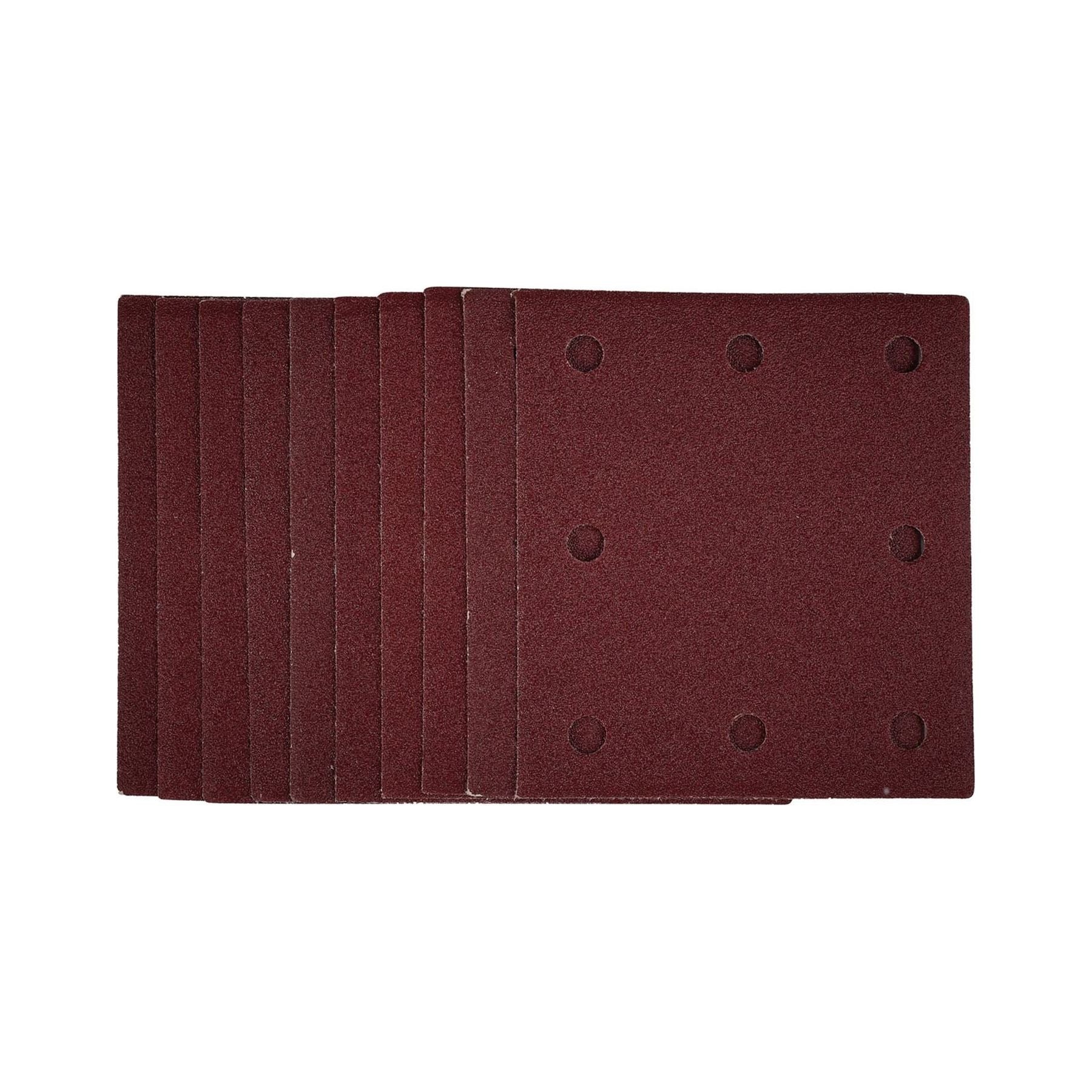 This pack of 1/4 sanding sheets (115 x 105mm) are made from premium quality aluminium oxide that is resin bonded to provide improved grain adhesion, anti-static qualities and long-lasting performance. The heavy-duty E-Weight backing paper makes the sanding sheet more durable able to withstand the toughest jobs. The hook and loop backing offers decent adhesion to facilitate the fast changing of sanding sheets. The eight pre-punched 8mm holes improve dust extraction. Ideal for sanding and finishing wood, metal, aluminium alloy, painted surfaces, plastic and fillers. Compatible with most 1/4 sanders with hook and loop including Stock No. 57691.