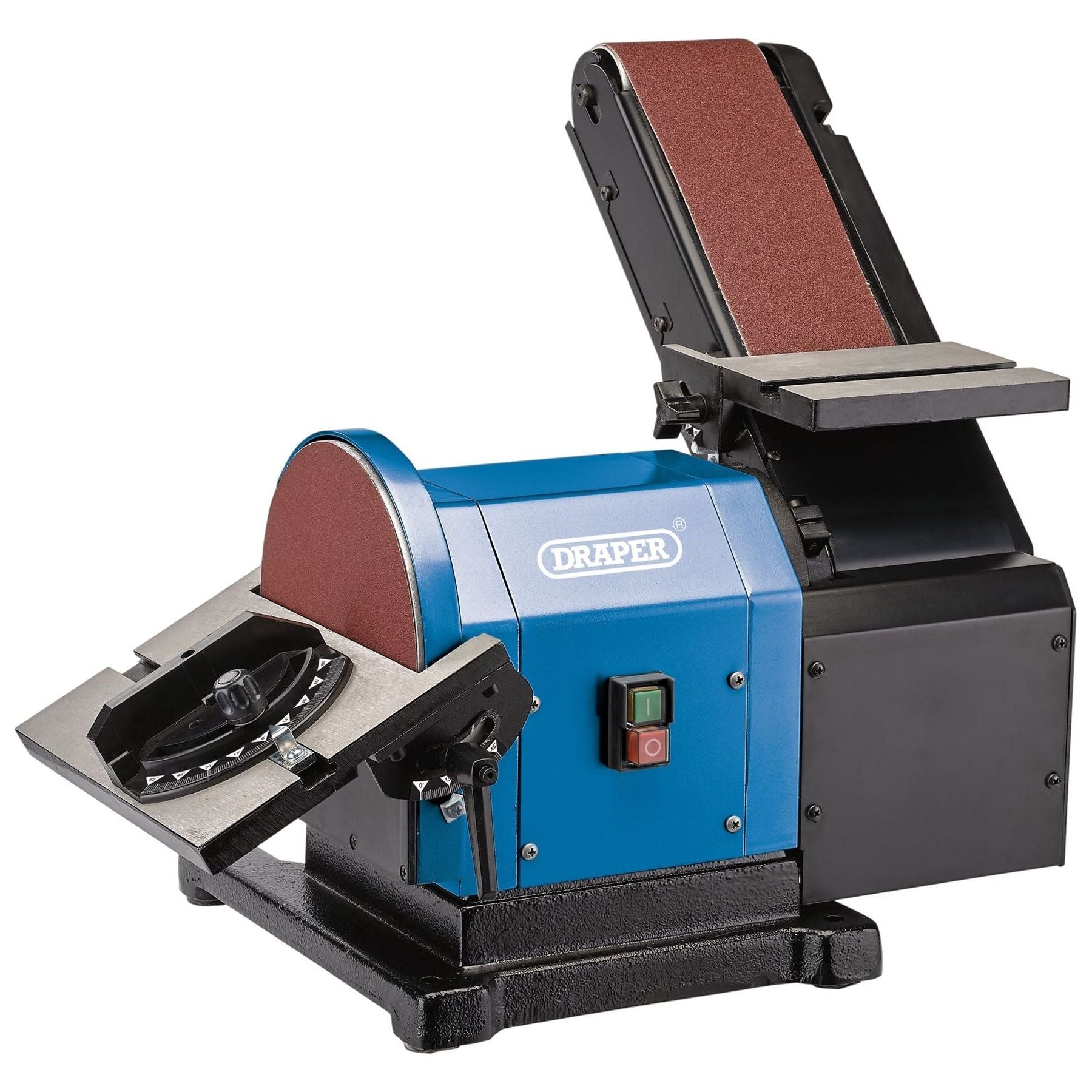 This robust belt and disc sander is powered by a 500W motor. The 100mm sanding belt can be positioned 0-90A°, horizontally or vertically. The 200mm diameter disc is provided with its own worktable and mitre gauge. The disc worktable can pivot from 0-45 degrees for accurate angle sanding. The discs are easily changed through the A€˜hoop & loopA€™ mechanism. The machine has a no volt switch for safety. To keep the workspace clean and safe, the sander has a dust exhaust, bag and clamp. It can also be attached to a vacuum for greater dust extraction. The machine is designed and manufactured for sanding wood and similar materials and should not be used to abrade or grind metal. Supplied with sanding belt and disc.