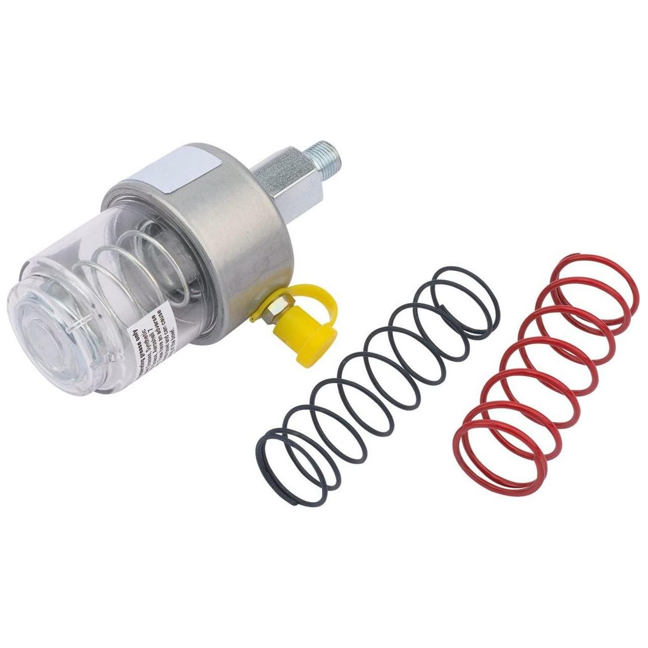 Expert Quality, 1/8" BSPT thread automatic grease feeder used for applying the optimum amount of grease at a constant discharge of 1 - 2 PSI. The transparent polycarbonate body offers easy refilling, which is achieved by using a standard grease gun. Suitable for use with NLGI 0 to NLGI 4 specification grease, within an operating temperature range of - 23 deg C to 121 deg C (- 10 to +250 deg F). Designed for use on machinery with excessive vibration or shock loadings or in hazardous areas. Able to be mounted in any position, including horizontal, vertical or upside down ensuring constant application lubrication. Supplied with three springs for adjusting the feed rate, ideal for different viscosities and operating temperatures: BLUE - light spring, SILVER - medium spring and RED - heavy spring. Display packed