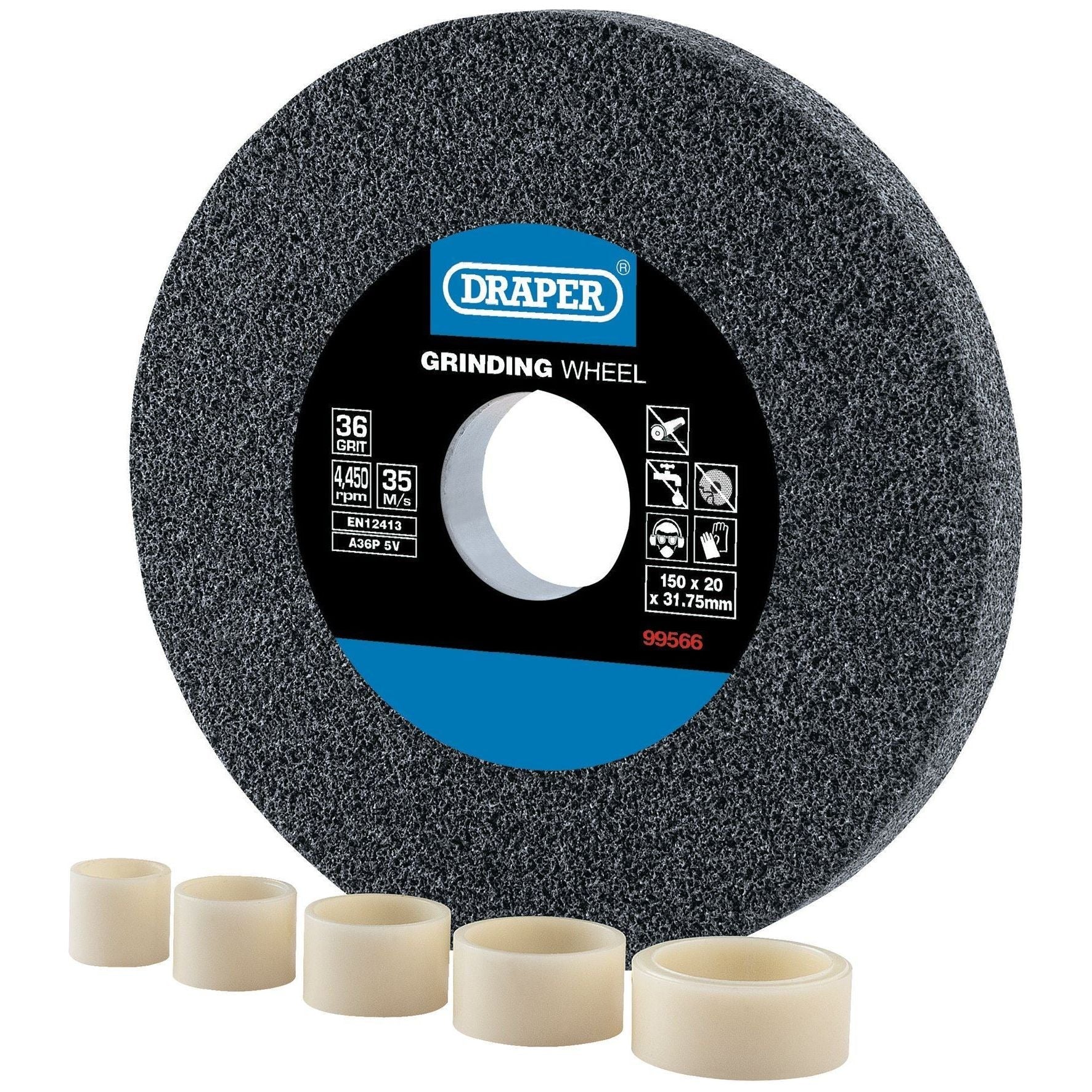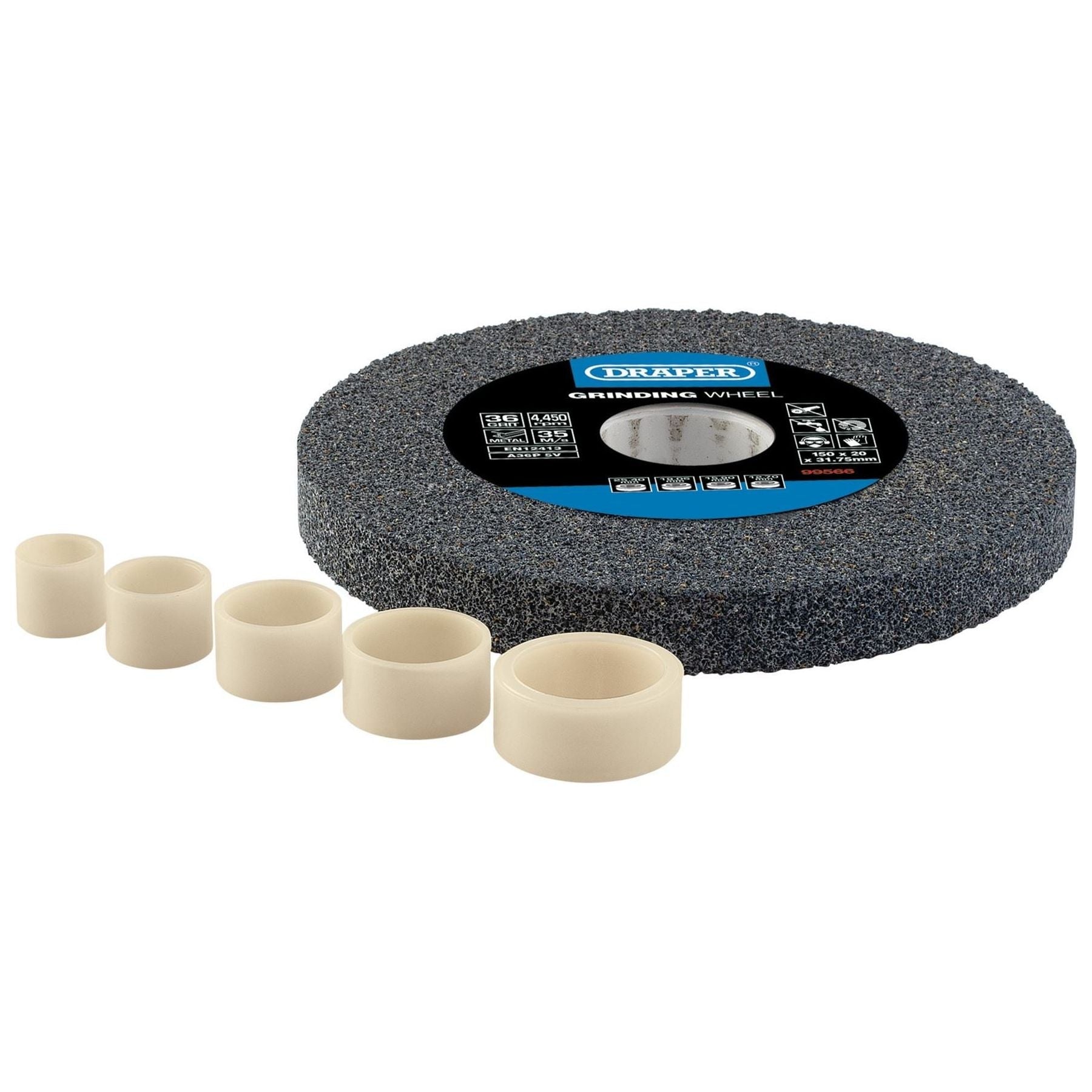 A high-quality, hard-wearing aluminium oxide bench grinding wheel with coarse grit. Suitable for general grinding, deburring and tool sharpening on non-ferrous metals and steel. Manufactured with a 31.75mm bore and supplied with 5 reduction rings enabling each bench grinding wheel to fit most bench grinders with a bore size between 12.7 – 31.75mm. Compatible with 19mm and 20mm wheel face Draper Bench Grinders.