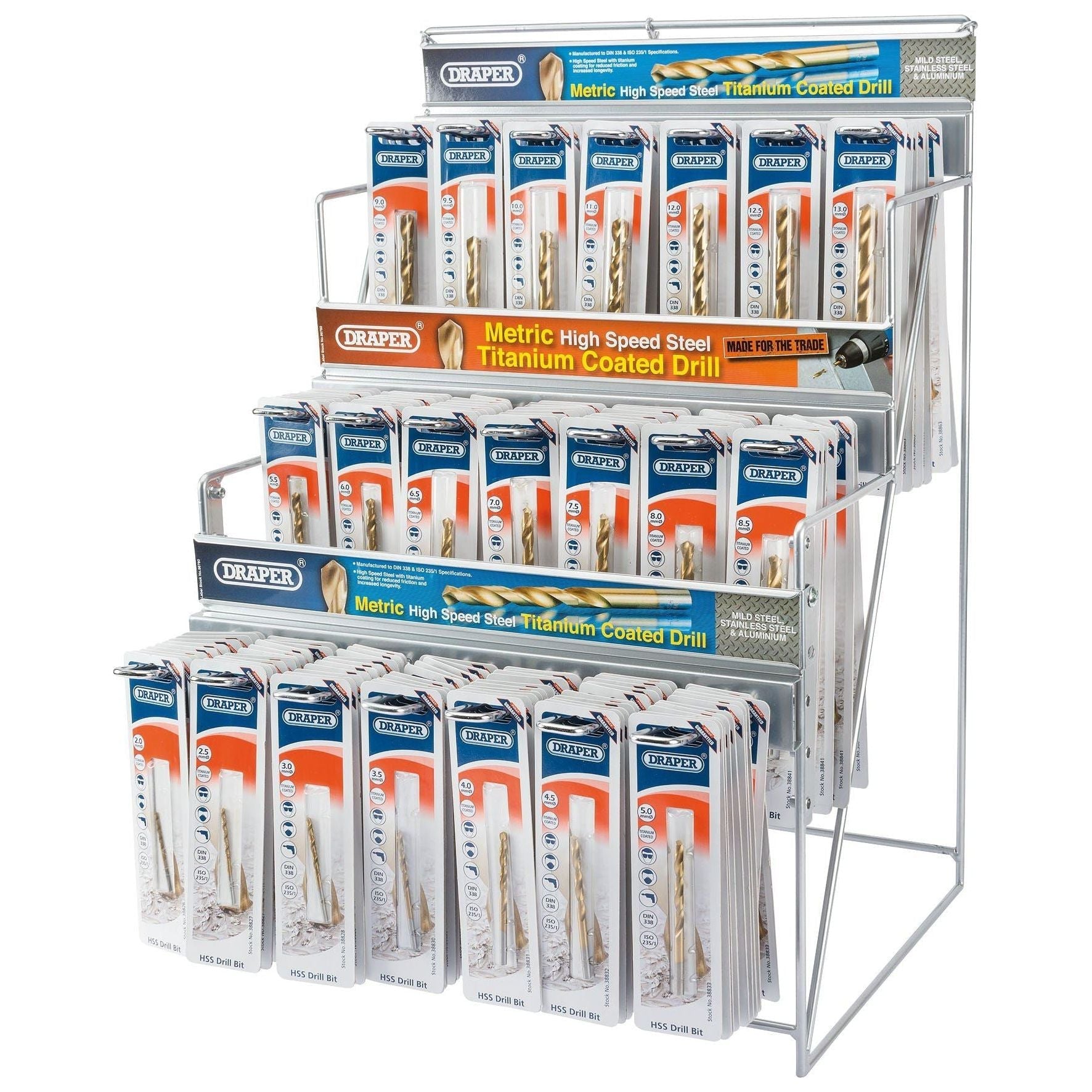 Toolbar merchandiser for 154-piece set of assorted metric HSS titanium drill bits for use on mild steel, stainless steel and aluminium. Supplied with stock and toolbar header. Pegs (Stock No.23056) available for order to complete your display.