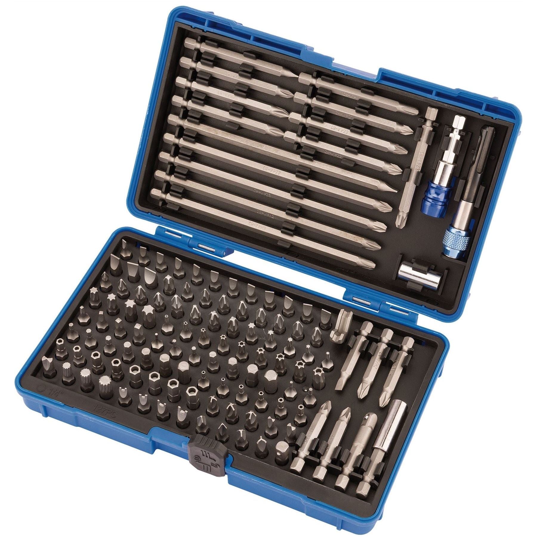 Expert Quality, comprehensive set of 1/4" bits manufactured from chrome vanadium steel, hardened and tempered with a shot blast finish. Bit holder with quick release collet allows bits to be expelled quickly and efficiently. Supplied in a heavy duty storage case with plastic inlay to hold bits securely. Display packed.