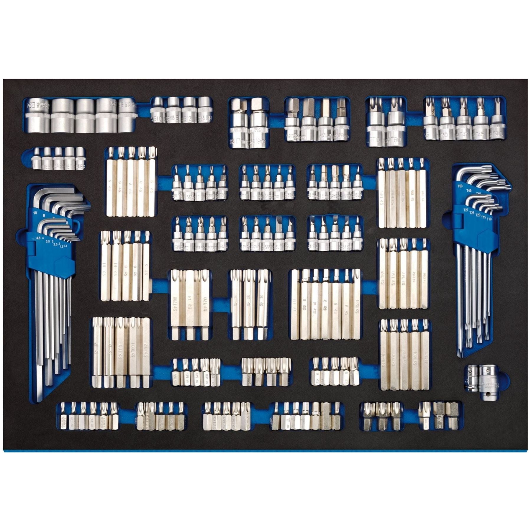 Expert Quality, selection of bits for automotive and workshop use, manufactured from S2 steel, which is correctly hardened and tempered, with a satin chromed finish. Supplied complete in a two tone full plus drawer EVA insert tray made from closed cell foam. Suitable to be used in Draper and Draper Expert tool chests and other manufacturers similar tool chests.