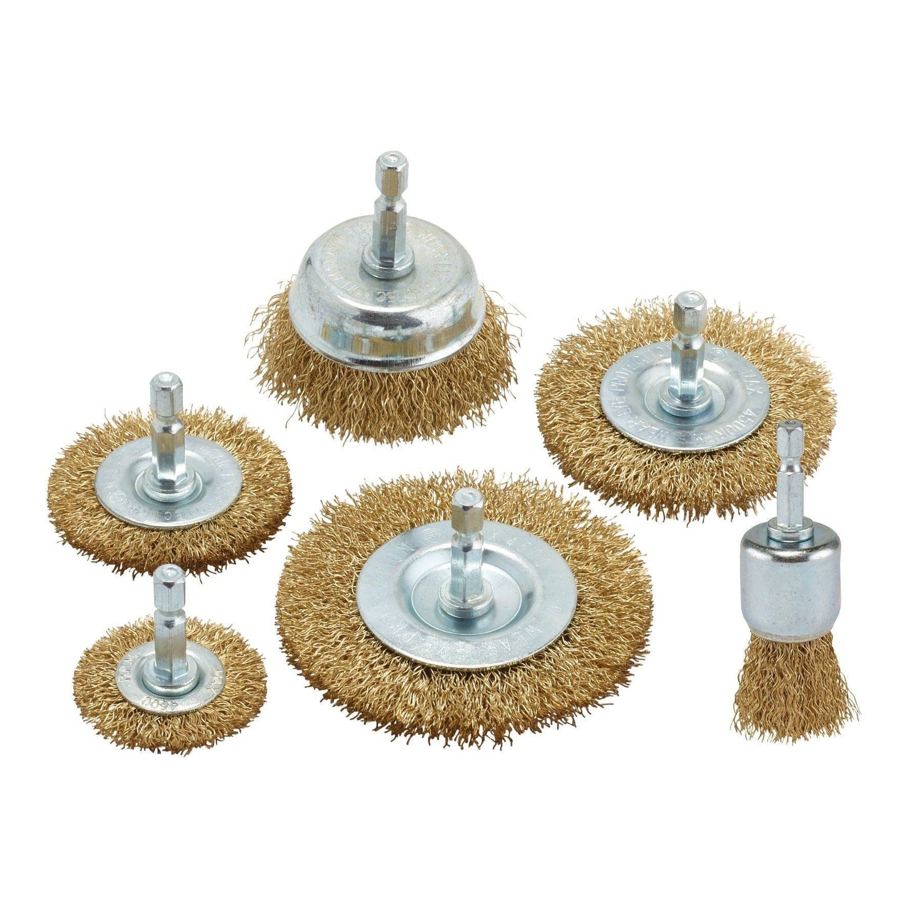 This set of wire brushes is designed for light to medium-duty work and delivers rapid stock removal from a wide variety of surfaces. The brushes are made from hardened dipped brassed steel wire, which gives a high level of durability and resistance to oxidation. The brushes are strong enough to provide reliable performance, and the crimping is flexible to tackle recessed areas and irregular surfaces. The set includes a 25mm wire end brush, 75mm wire cup brush, and three wire wheel brushes (50, 75, 100mm). Fitted with a non-slip 6.35mm hex shank. Compatible with most drill drivers and drills with a 13mm chuck.