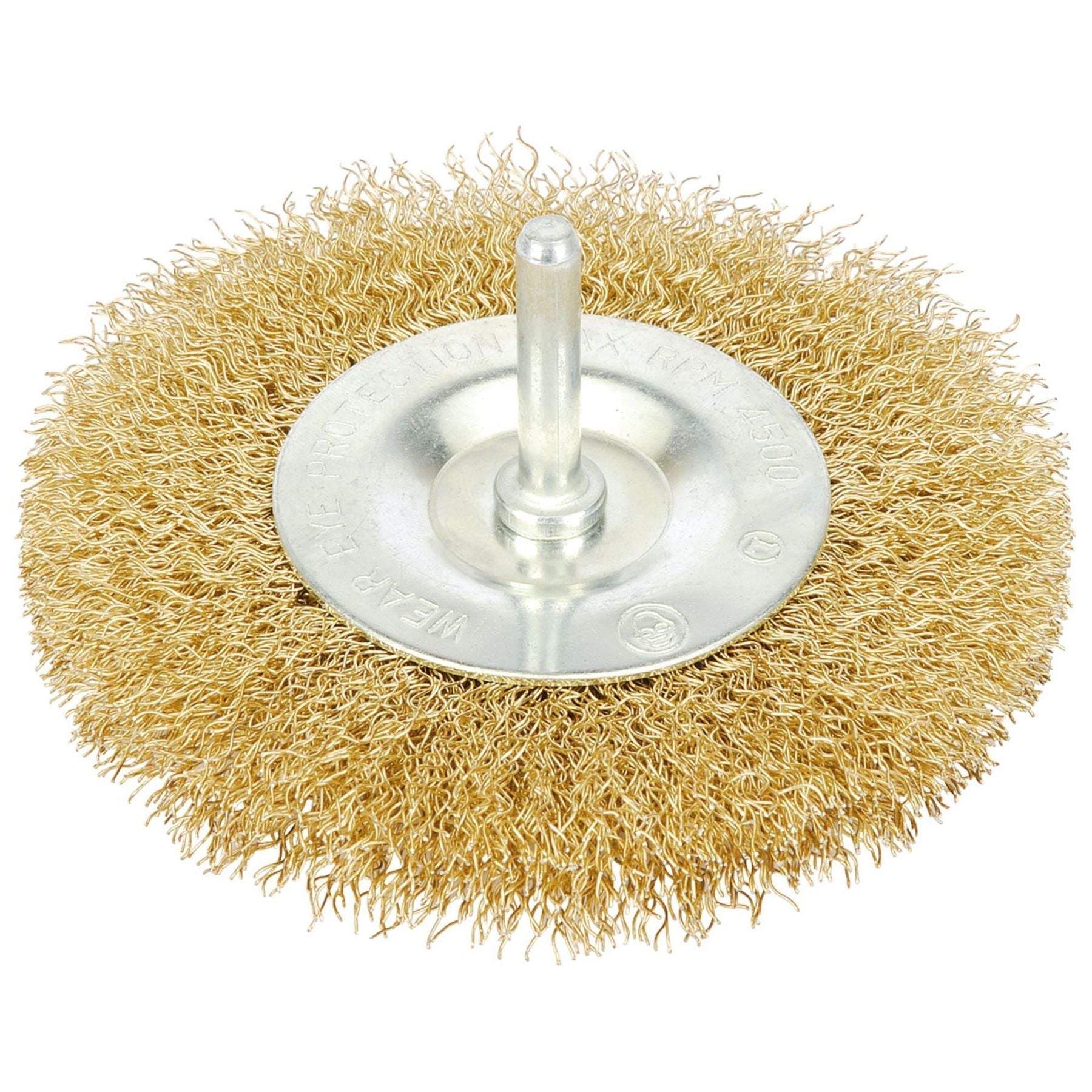 These wire wheel brushes are designed for light to medium-duty work and delivers rapid stock removal from a wide variety of surfaces. The bristles are made from hardened dipped brassed steel wire, which gives a high level of durability and resistance to oxidation. The brush is strong enough to provide reliable performance, and the crimping is flexible to tackle recessed areas and irregular surfaces. The wheel shape is designed to work perpendicular to the surface, making it ideal for smaller and tighter areas. Fitted with a non-slip 6.35mm hex shank. Compatible with most drill drivers and drills with a 13mm chuck.