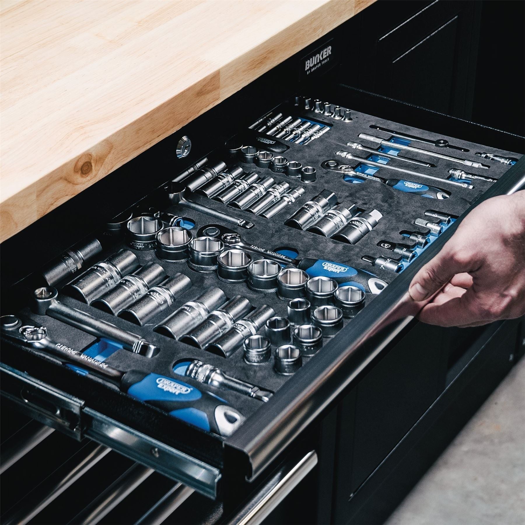 Part of the BUNKER® modular storage system. This stunningly designed premium-quality steel unit has five drawers embellished with stylish aluminium handles. Each drawer has a smooth soft-close operation and is lined with lush foam to protect your tools. The feet of the cabinet are adjustable for optimal positioning on an uneven floor. The cabinet’s matt black textured finish is highly durable, thanks to the industrial powder coating that protects against scratches, wear and corrosion. It has an integral lock for security and is supplied with two keys. The cabinet is delivered fully assembled and measures W 680 x H 910 x D 458mm. It can be used as an individual storage cabinet in conjunction with either a stainless steel or hardwood worktop or as part of the BUNKER® modular storage system, which includes 24 clever modular options. It comes supplied with all the required fittings for simple installation. For your quality assurance, all BUNKER® units include a 10-year warranty.