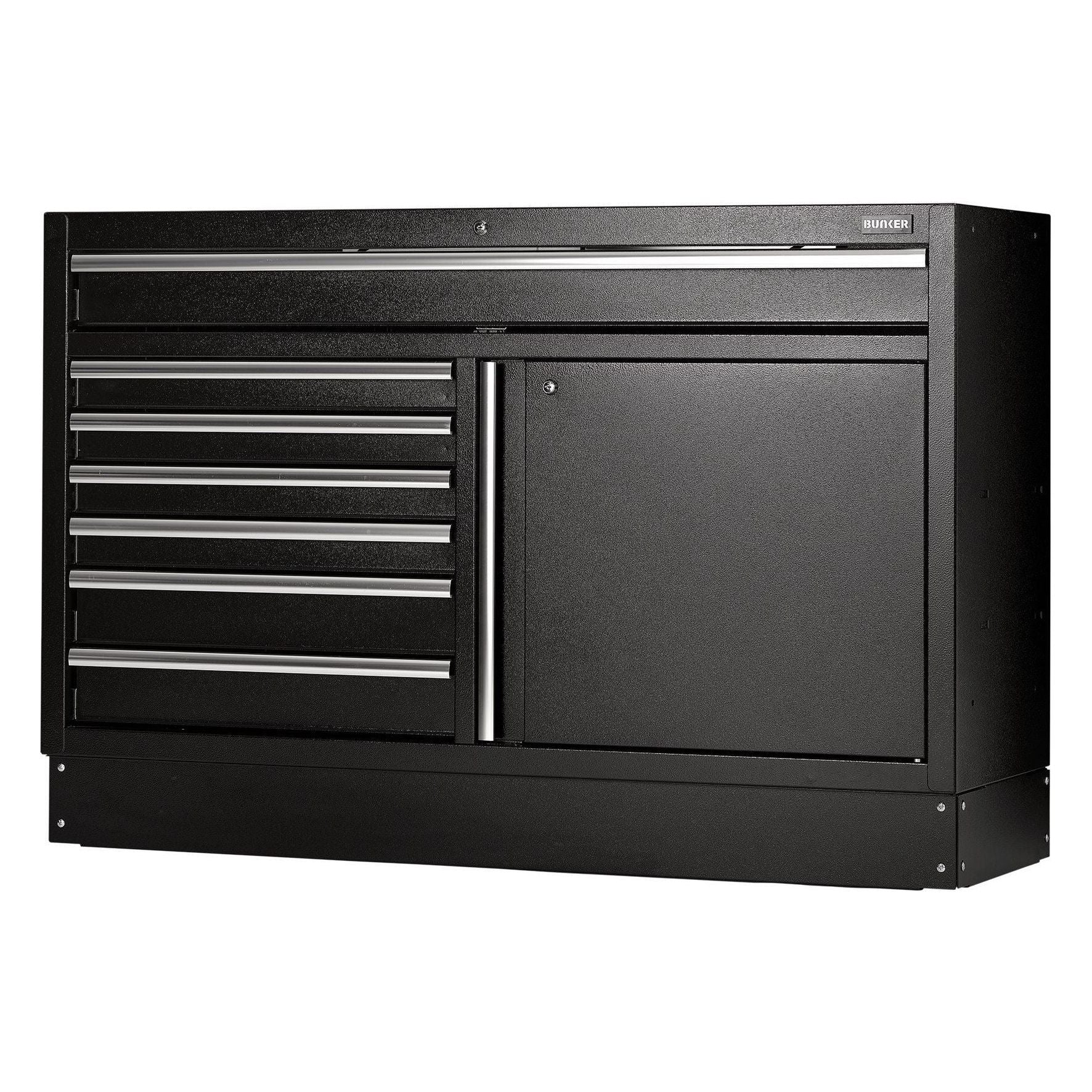 Part of the BUNKER modular storage system. This stunningly designed premium-quality steel unit has seven drawers embellished with stylish aluminium handles. Each drawer has a smooth soft-close operation and is lined with lush foam to protect your tools. There is a cupboard offering excellent storage space with an adjustable shelf, accessible by a single cupboard door with aluminium handle. The feet of the cabinet are adjustable for optimal positioning on an uneven floor. The cabinet’s matt black textured finish is highly durable, thanks to the industrial powder coating that protects against scratches, wear and corrosion. It has an integral lock for security and is supplied with two keys. The cabinet is delivered fully assembled and measures W 1360 x H 910 x D 468mm. It can be used as an individual storage cabinet in conjunction with either a stainless steel or hardwood worktop or as part of the BUNKER modular storage system, which includes 24 clever modular options. It comes supplied with all the required fittings for simple installation. For your quality assurance, all BUNKER units include a 10-year warranty.