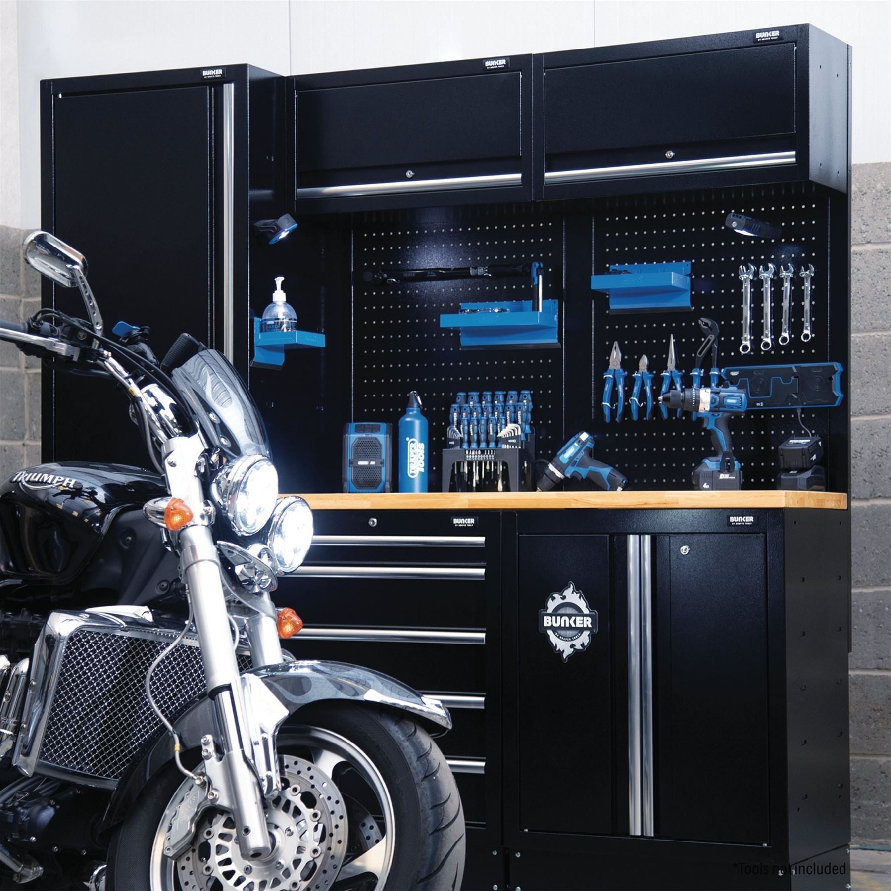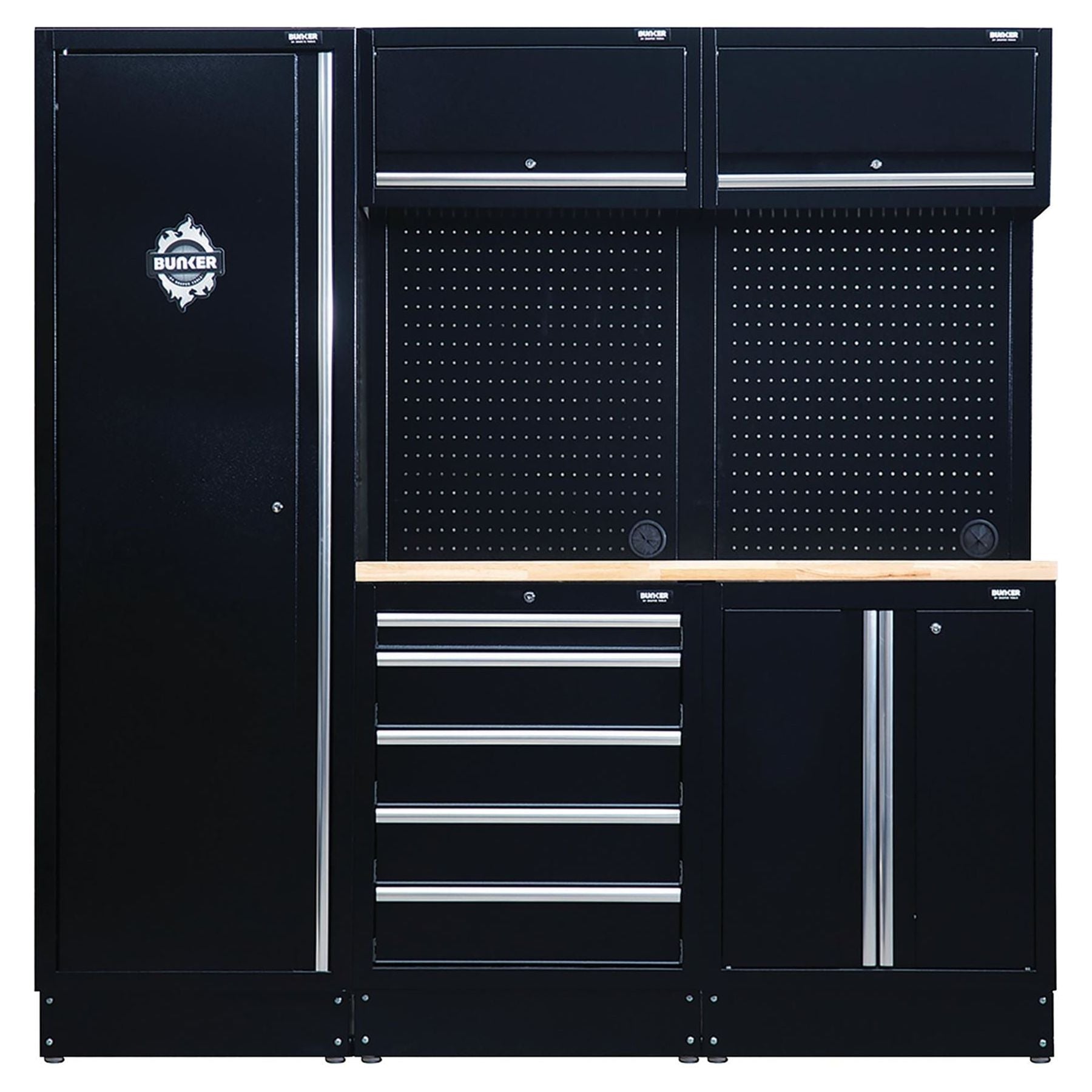 Part of the BUNKER® modular storage system. This stunningly designed combo is easily installed inside a garage or workshop to create your ideal storage system. All units are made from premium-quality steel and have a durable matt black textured industrial powder-coated finish. The floor cabinets are covered by a stylish hardwood worktop and provide incredibly versatile storage, featuring large cupboards with fully adjustable shelves and smooth soft-close drawers lined with lush foam to protect your tools. The fixed base cabinets have adjustable feet for optimal positioning on an uneven floor. All wall cabinets have lift-up doors for convenient access, operated by whisper-quiet gas struts. For added storage, the back panels act as pegboards, and each includes one pre-cut hole for access to a power supply. Each unit has an integral lock for security and two keys are supplied. The combo comes with all the required fittings for simple installation. For your quality assurance, all BUNKER® units include a 10-year warranty. Every combo includes a free magnet of the distinctive BUNKER® logo.
