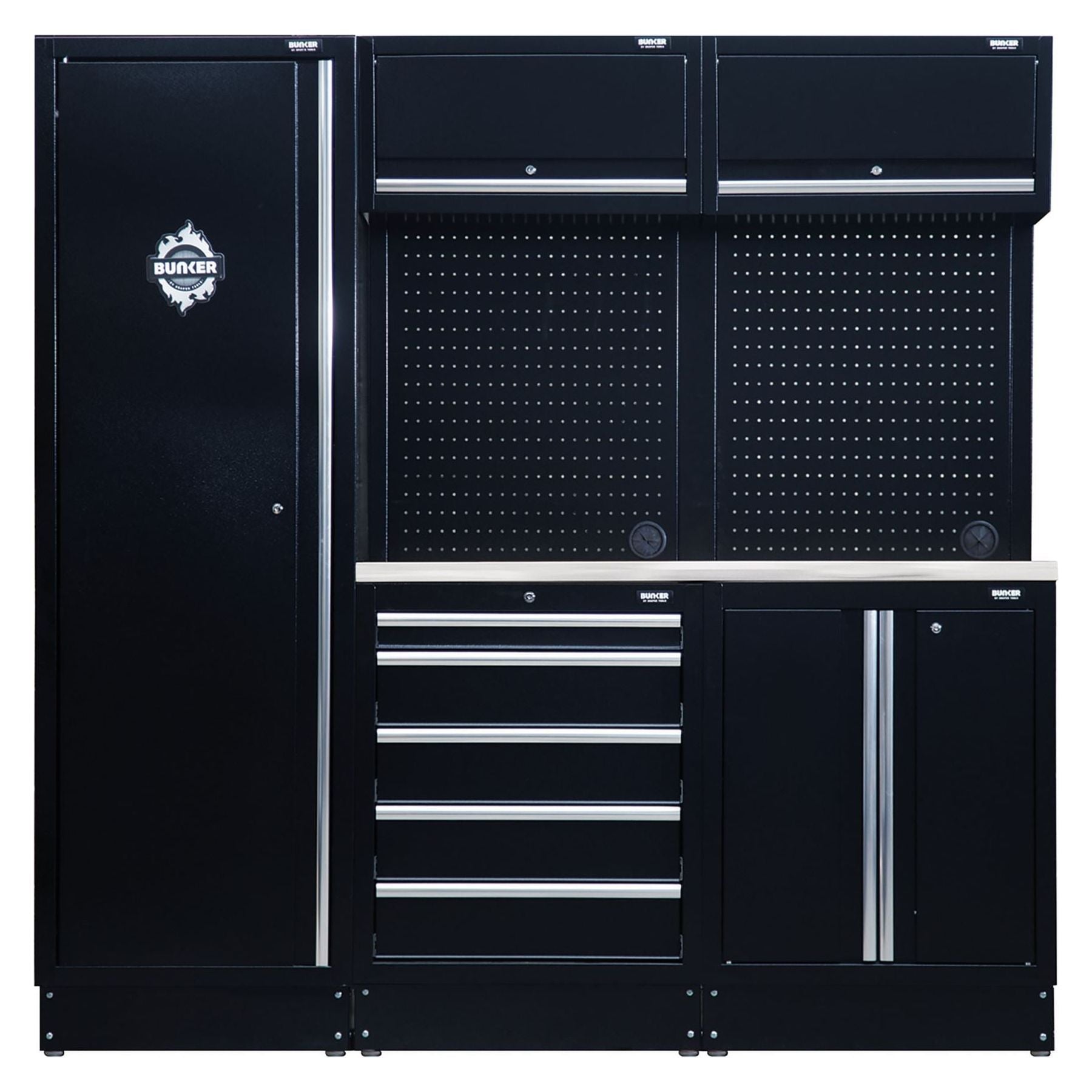 Part of the BUNKER® modular storage system. This stunningly designed combo is easily installed inside a garage or workshop to create your ideal storage system. All units are made from premium-quality steel and have a durable matt black textured industrial powder-coated finish. The floor cabinets are covered by a stylish stainless steel worktop and provide incredibly versatile storage, featuring large cupboards with fully adjustable shelves and smooth soft-close drawers lined with lush foam to protect your tools. The fixed base cabinets have adjustable feet for optimal positioning on an uneven floor. All wall cabinets have lift-up doors for convenient access, operated by whisper-quiet gas struts. For added storage, the back panels act as pegboards, and each includes one pre-cut hole for access to a power supply. Each unit has an integral lock for security and two keys are supplied. The combo comes with all the required fittings for simple installation. For your quality assurance, all BUNKER® units include a 10-year warranty. Every combo includes a free magnet of the distinctive BUNKER® logo.