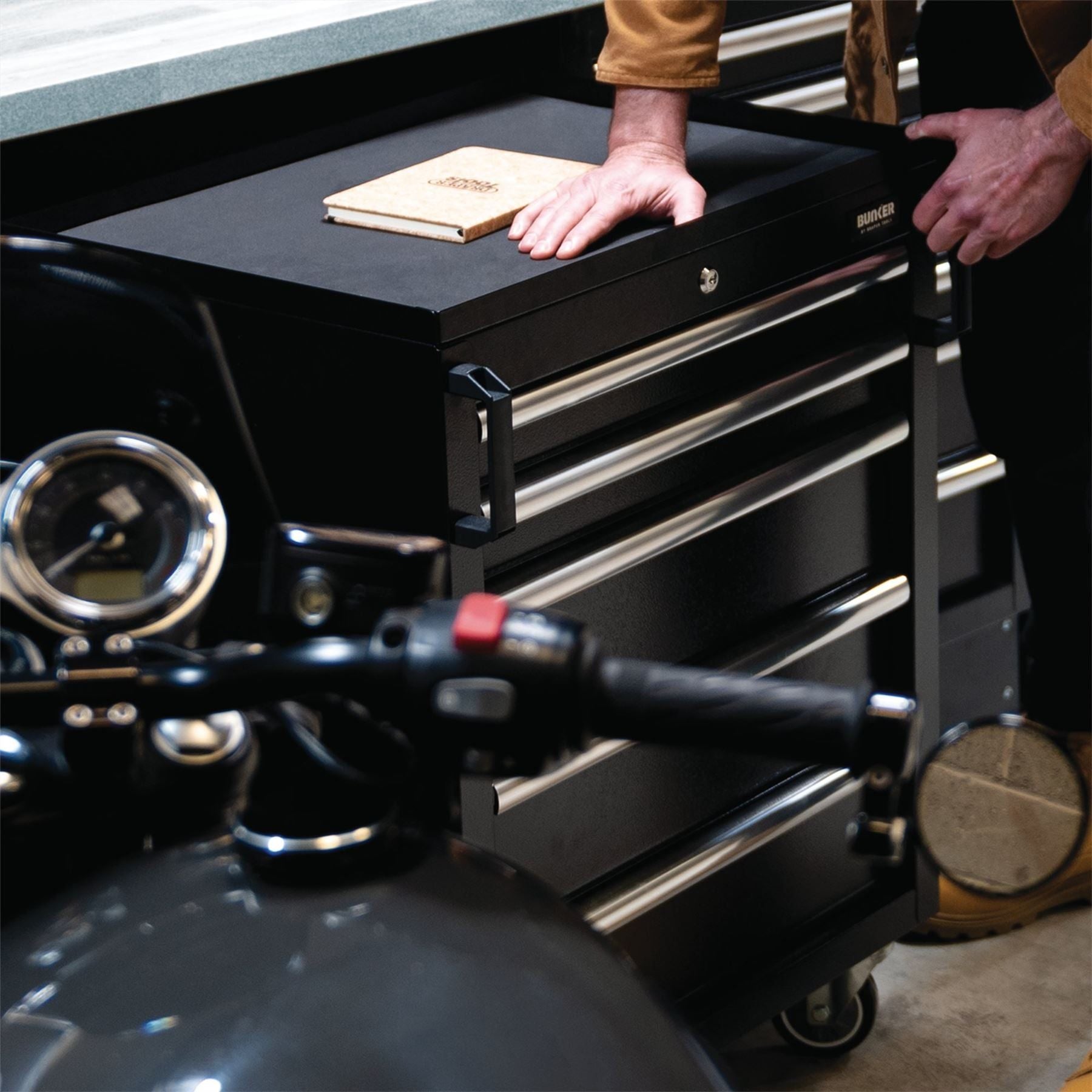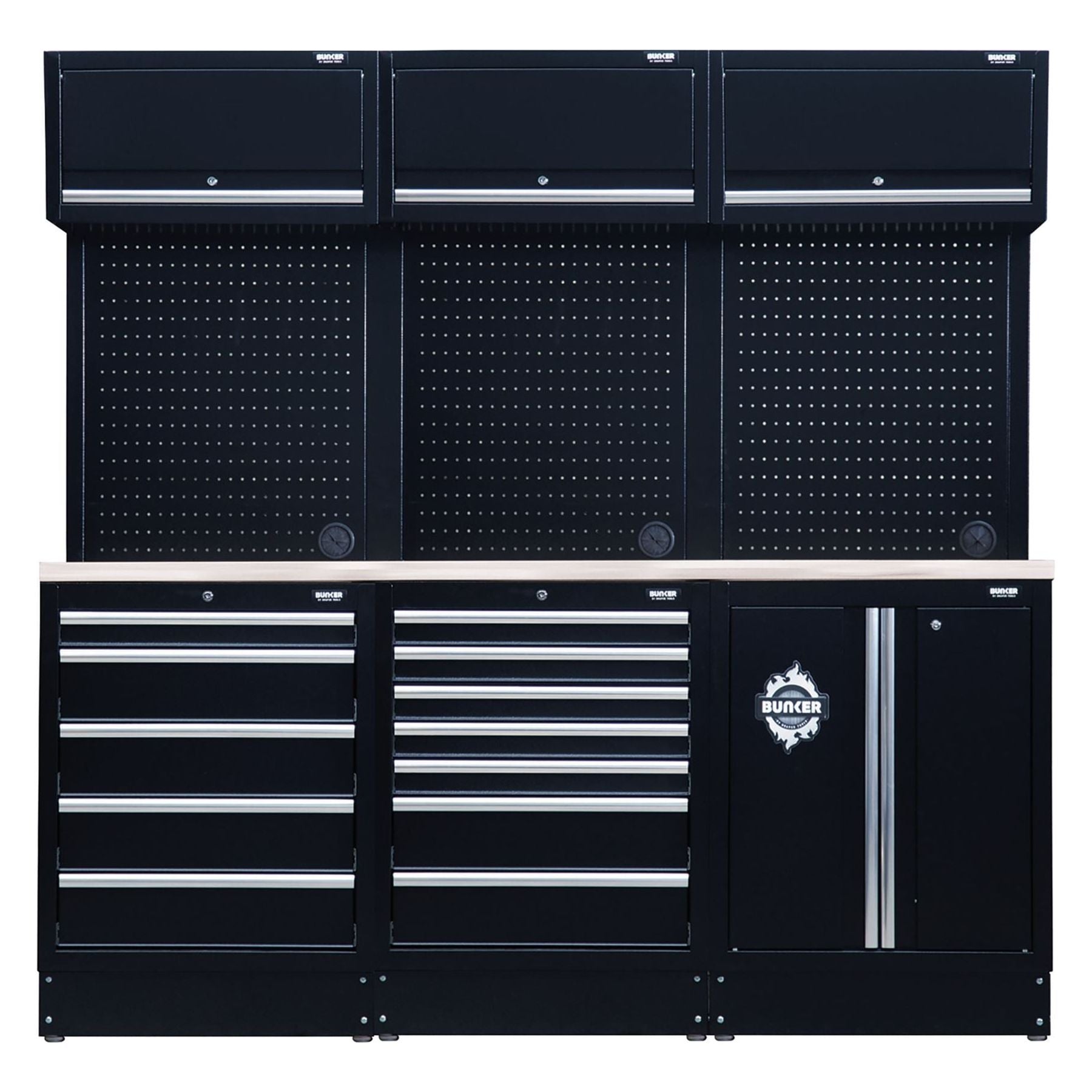 Part of the BUNKER® modular storage system. This stunningly designed combo is easily installed inside a garage or workshop to create your ideal storage system. All units are made from premium-quality steel and have a durable matt black textured industrial powder-coated finish. The floor cabinets are covered by a stylish stainless steel worktop and provide incredibly versatile storage, featuring large cupboards with fully adjustable shelves and smooth soft-close drawers lined with lush foam to protect your tools. The fixed base cabinets have adjustable feet for optimal positioning on an uneven floor. All wall cabinets have lift-up doors for convenient access, operated by whisper-quiet gas struts. For added storage, the back panels act as pegboards, and each includes one pre-cut hole for access to a power supply. Each unit has an integral lock for security and two keys are supplied. The combo comes with all the required fittings for simple installation. For your quality assurance, all BUNKER® units include a 10-year warranty. Every combo includes a free magnet of the distinctive BUNKER® logo.