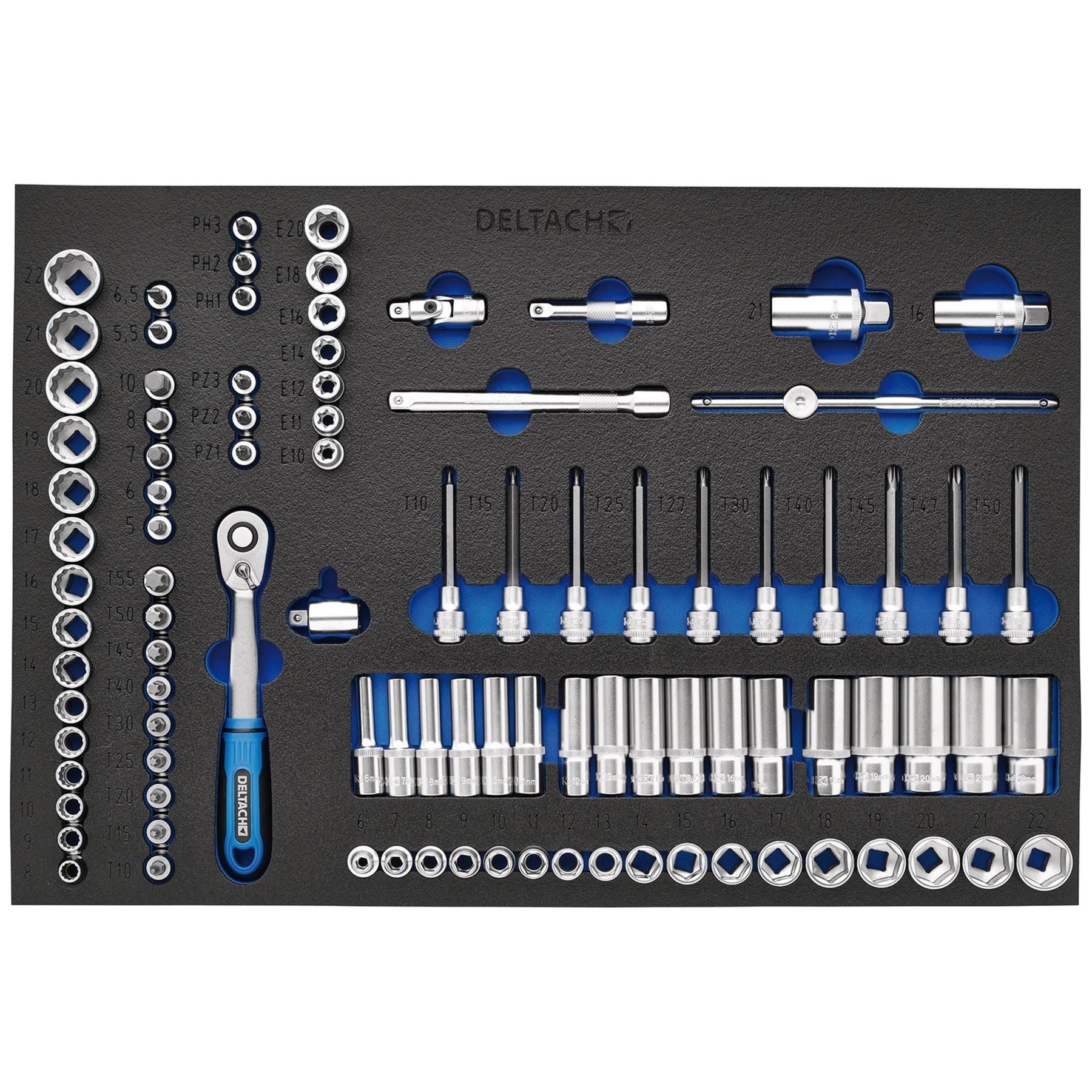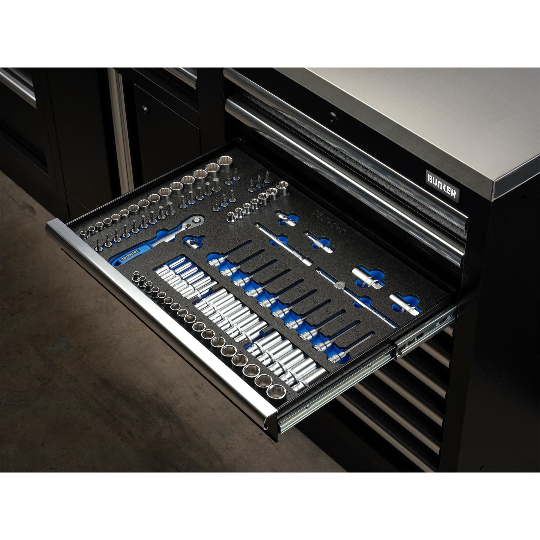 The BUNKER socket set is produced by Deltach, a leading German manufacturer of high-quality hand tools. This tool set is organised in EVA foam for protective storage within BUNKER drawers. The dimensions of the EVA foam inlay are L 565 x W 397 x H 35mm, specifically designed to fit BUNKER modular floor cabinets.