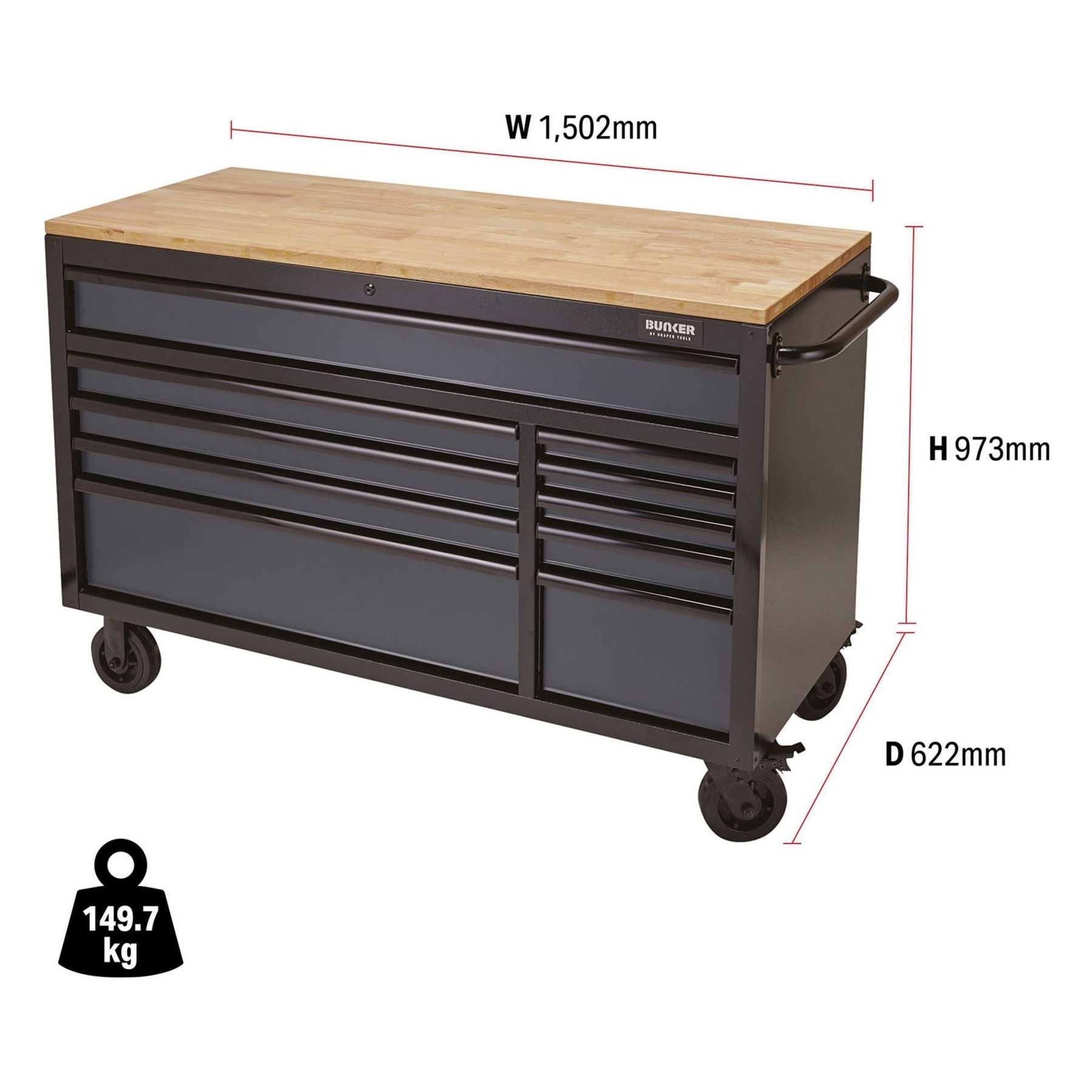 Part of the BUNKER® storage range. This stunningly designed 56" premium-quality steel unit has ten drawers embellished with a stylish black anodised aluminium trim. Each drawer has a smooth soft-close operation and is lined with lush foam to protect your tools. The cabinet’s matt grey textured finish is highly durable, thanks to the industrial powder coating that protects against scratches, wear and corrosion. This is a mobile cabinet, allowing you to keep useful items to hand wherever you need them in your garage. The 25mm-thick hardwood worktop spans the whole surface of the unit, providing a handy workspace. For ease of manoeuvrability, there is a steel handle and four durable castor wheels. Two of the wheels are fitted with brakes to keep the tool cabinet still. It has an integral lock for security and is supplied with two keys. The unit requires partial assembly and measures W 1,502 x H 973 x D 622mm. For your quality assurance, all BUNKER® units include a 10-year warranty.
