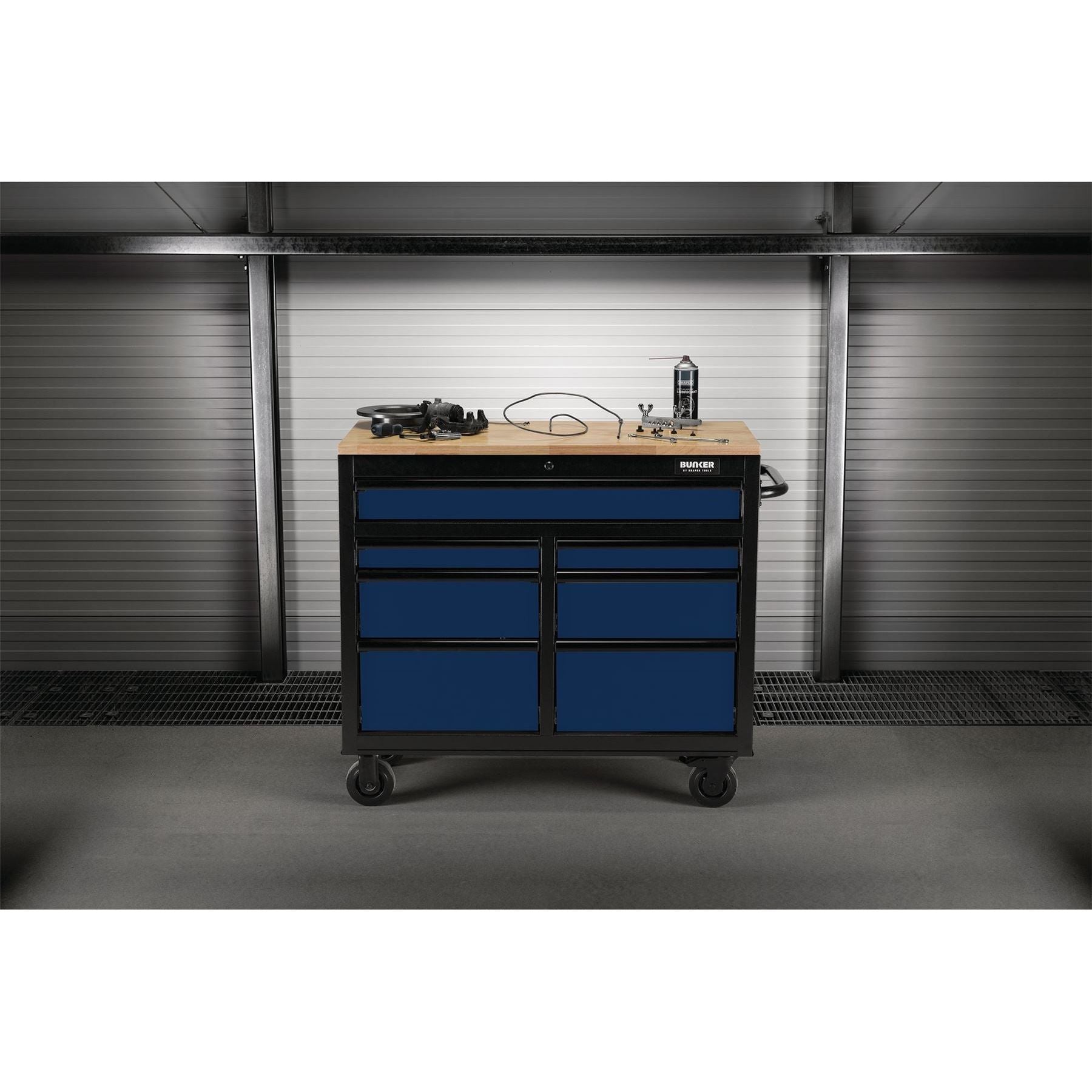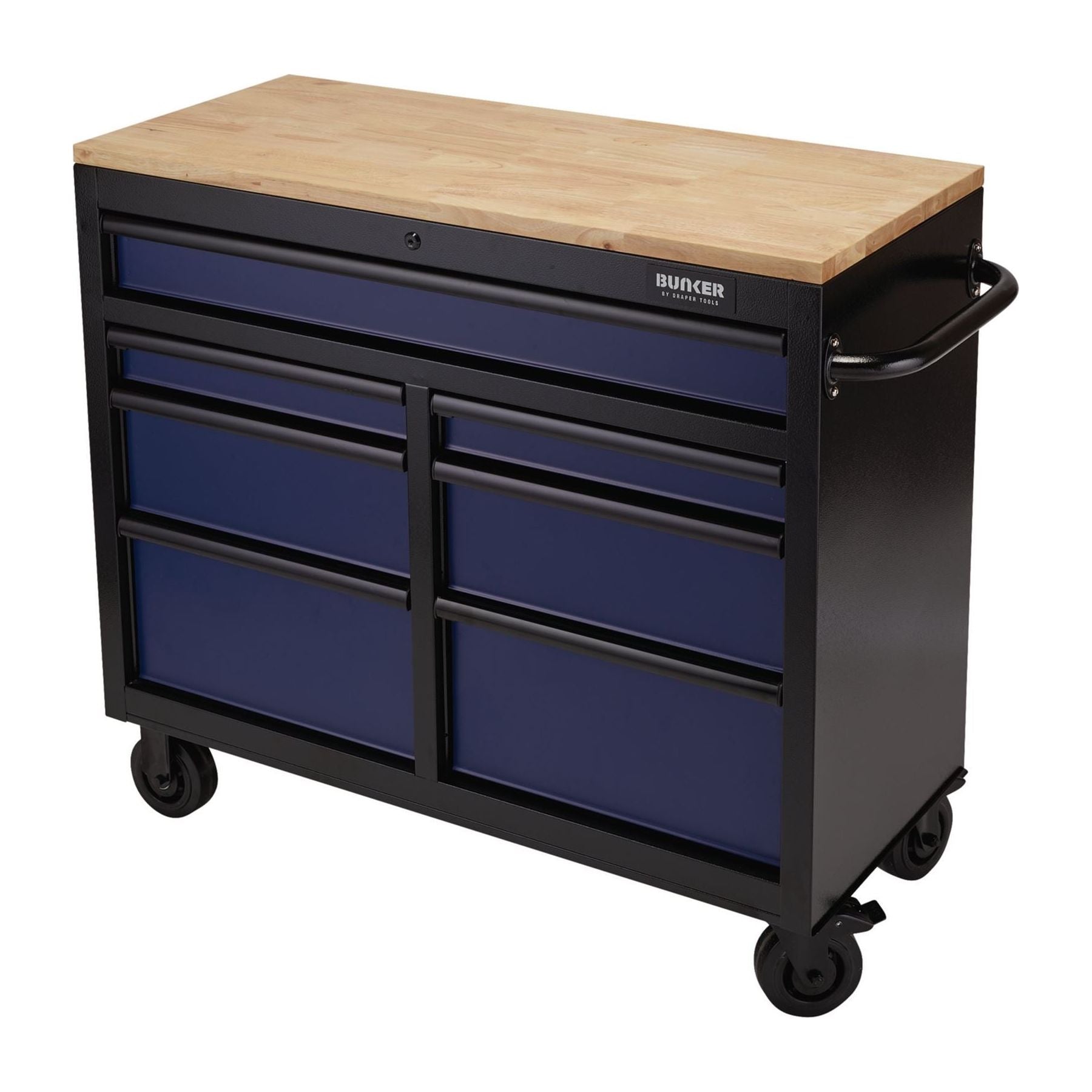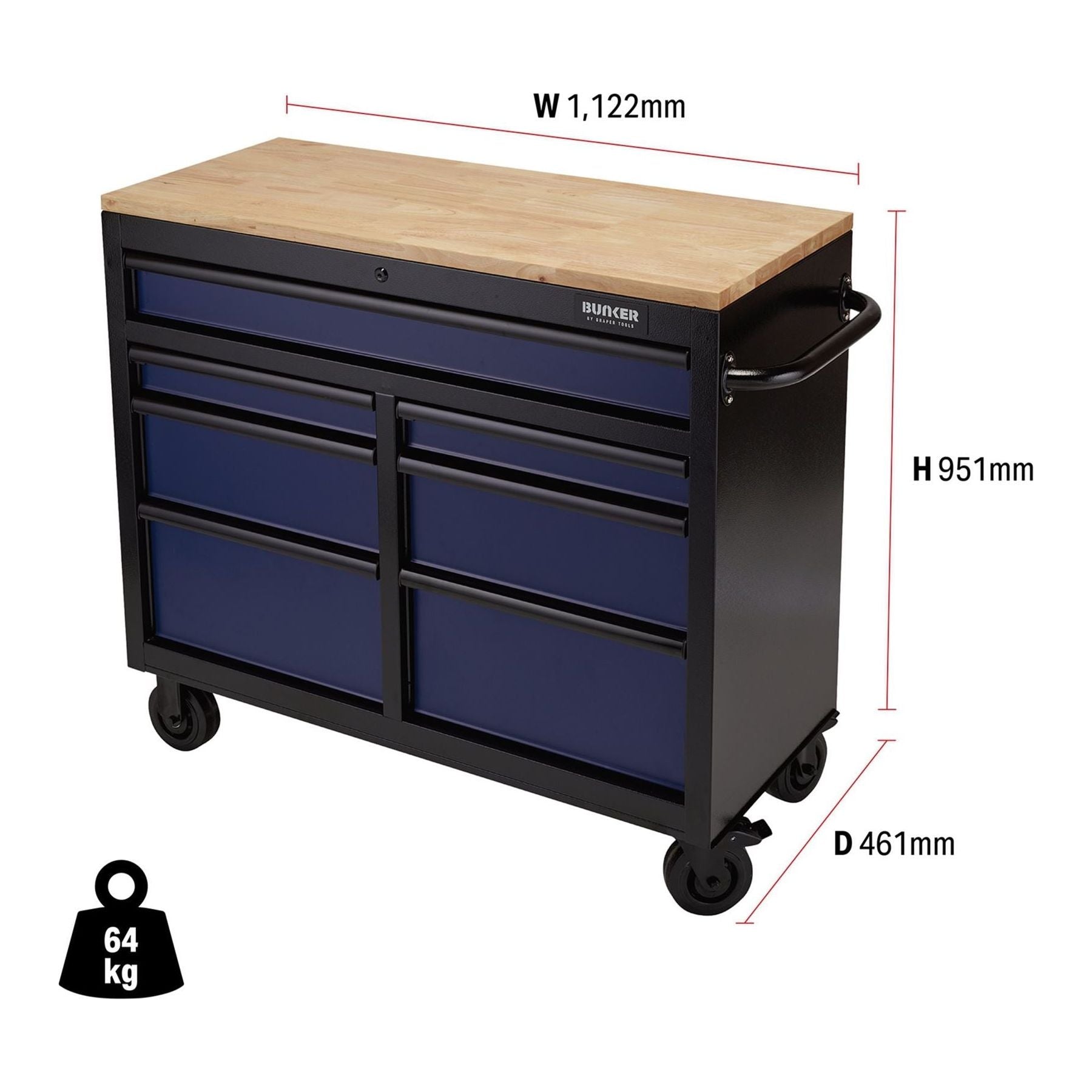 Part of the BUNKER® storage range. This stunningly designed 41" premium-quality steel unit has seven drawers embellished with a stylish black anodised aluminium trim. Each drawer has a smooth soft-close operation and is lined with lush foam to protect your tools. The cabinet’s matt blue textured finish is highly durable, thanks to the industrial powder coating that protects against scratches, wear and corrosion. This is a mobile cabinet, allowing you to keep useful items to hand wherever you need them in your garage. The 25mm-thick hardwood worktop spans the whole surface of the unit, providing a handy workspace. For ease of manoeuvrability, there is a steel handle and four durable castor wheels. Two of the wheels are fitted with brakes to keep the tool cabinet still. It has an integral lock for security and is supplied with two keys. The unit requires partial assembly and measures W 1,122 x H 951 x D 461mm. For your quality assurance, all BUNKER® units include a 10-year warranty.