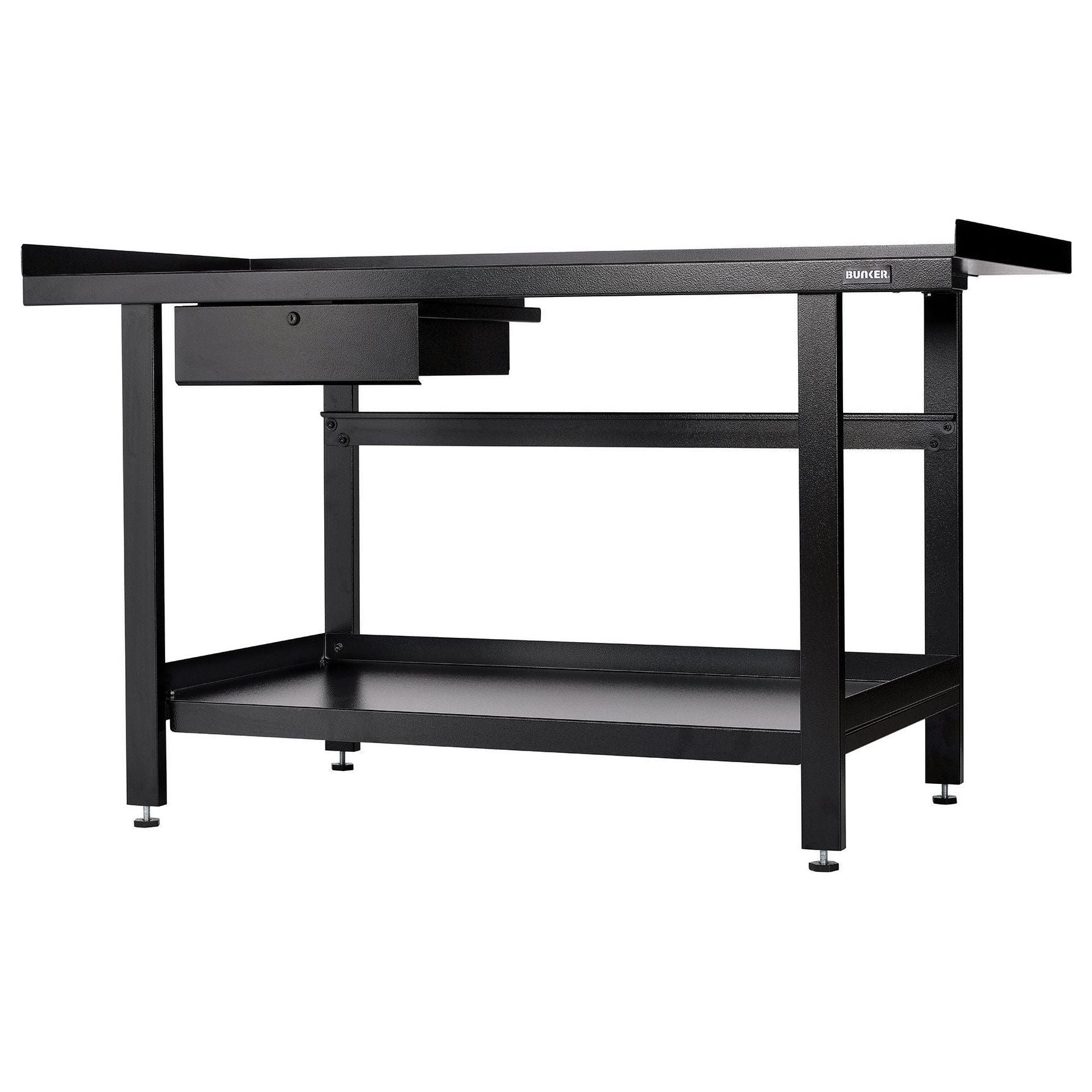 The BUNKER workbench includes a worktop, storage shelf, and drawer. Its industrial matt textured powder coating protects it from scratches, wear, and corrosion.