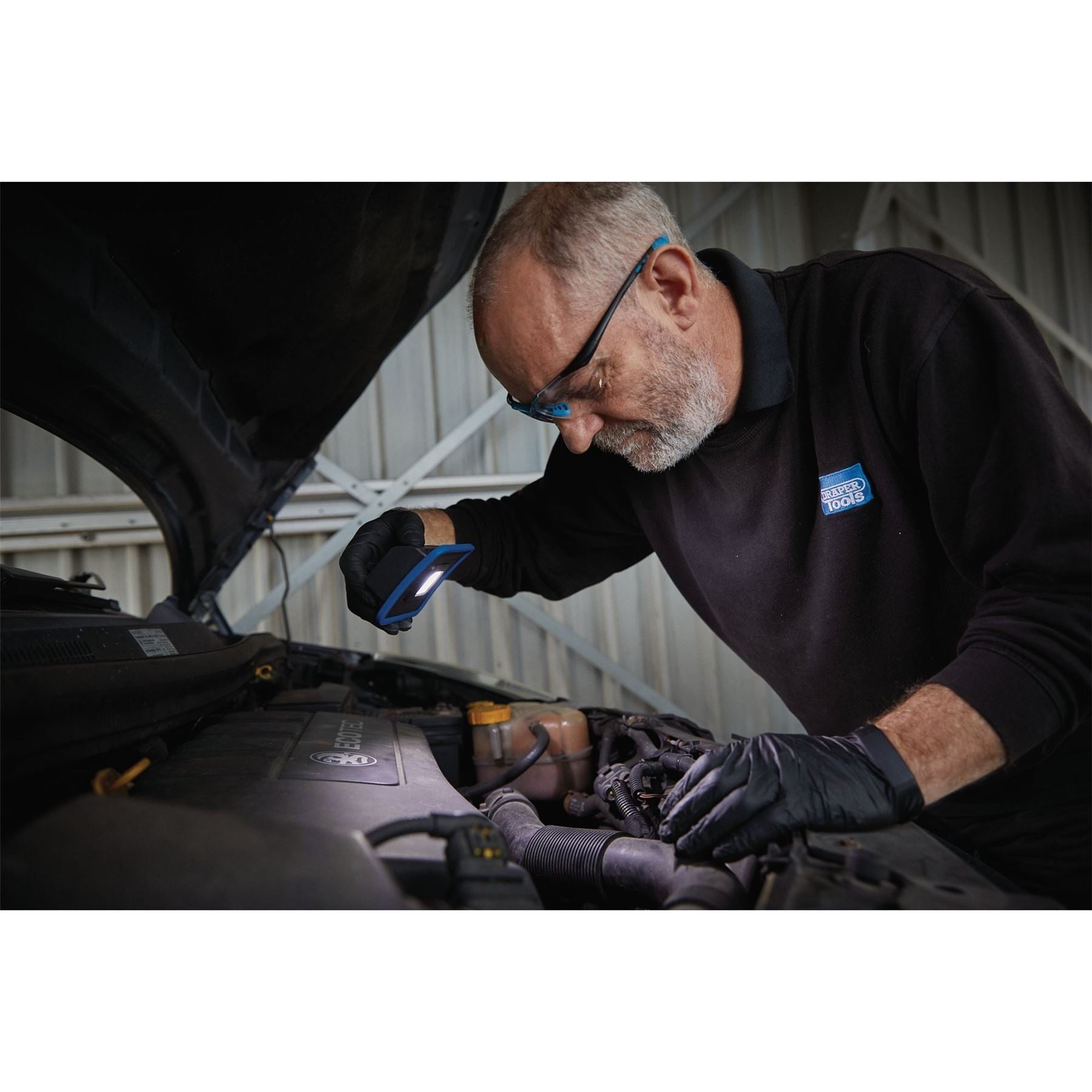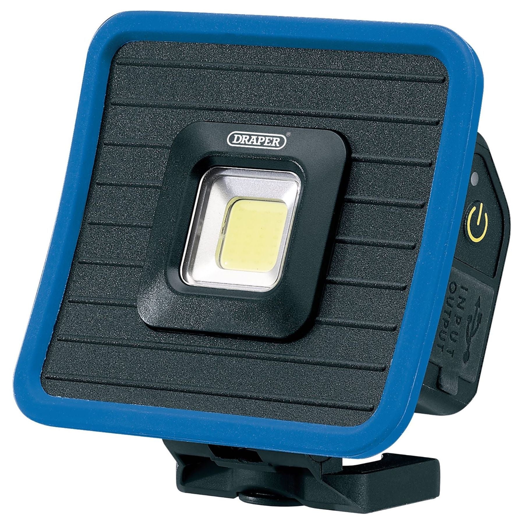Compact and durable COB LED mini flood light and power bank for charging mobile devices. Fitted with a strong magnetic base and useful hanging hook for hands-free use. Provides three light output settings: low, high and flash offering a brightness of 500-1000 Lumens (low to high/flash). Simple push button operation for on/off and lighting modes, with memory function set to recall the last lighting mode used. Fitted with an integral adjustable bracket which can rotate through 180° for optimal light positioning and ring finger for portability. USB input and output with power bank function for charging electronic devices. Supplied with USB-C charging cable.
