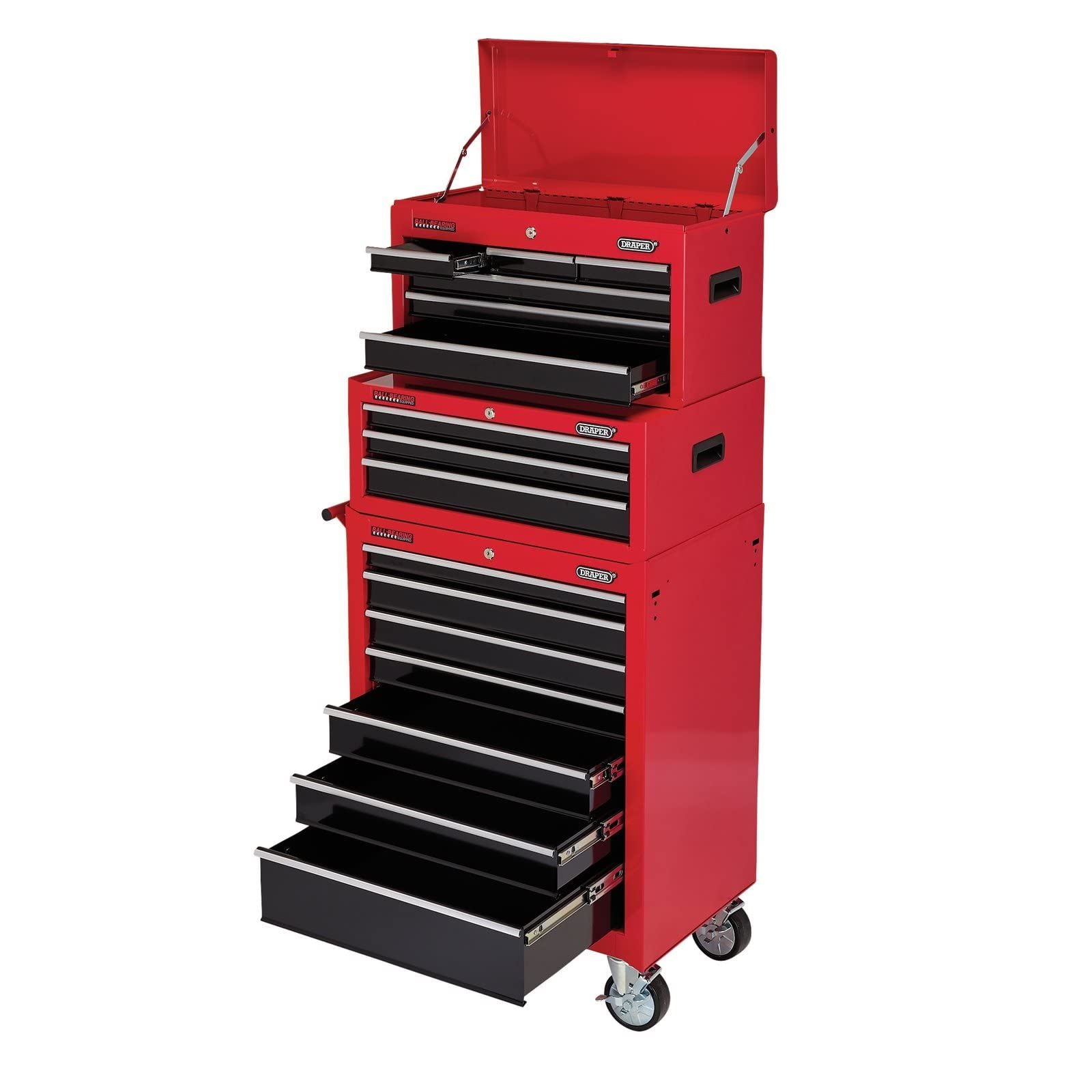 This is a combination of three units (roller cabinet, mid-section and top chest) to create a great workshop storage solution, stylishly finished with a red frame and black drawers. Manufactured from sheet steel with a powder-coated finish and aluminium trim effect. The drawers are fitted with ball-bearing sliders to provide smoother operation and a protective foam liner. The roller cabinet has a heavy-duty pull handle and sturdy carry handles plus two braked and two fixed heavy-duty swivel castors: an ideal configuration for easy mobility. Each unit has a secure integral locking system. Supplied with two keys.