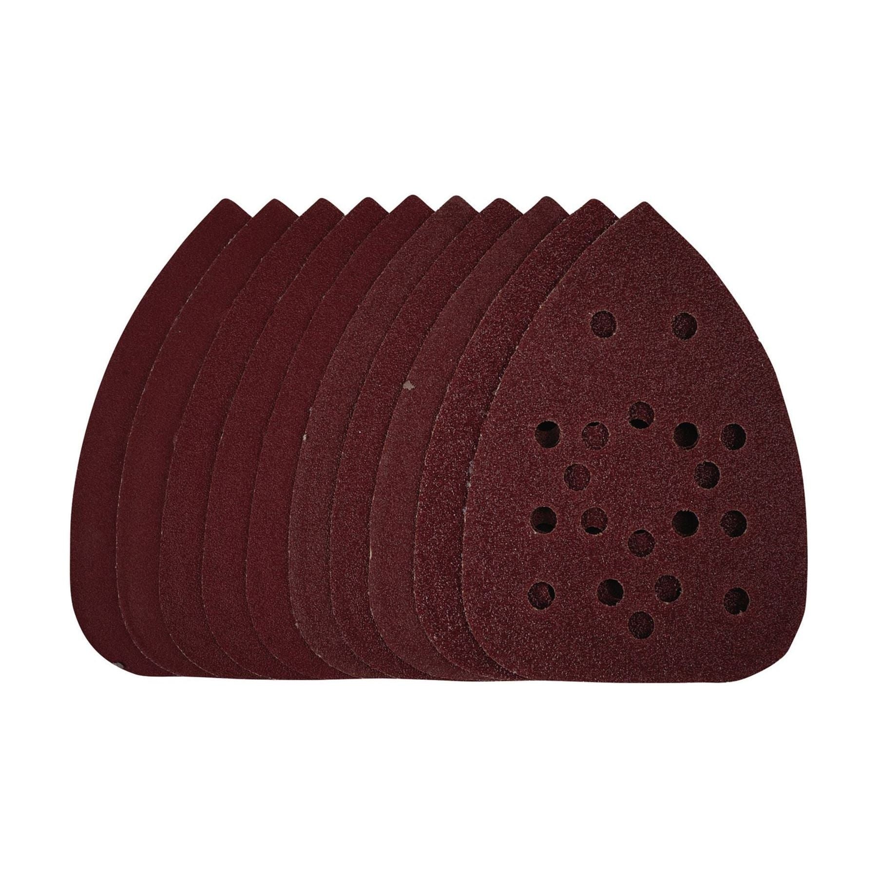 This pack of 140mm detail sanding sheets are made from premium quality aluminium oxide that is resin bonded to provide improved grain adhesion, anti-static qualities and long-lasting performance. The heavy-duty E-Weight backing paper makes the sanding sheet more durable – able to withstand the toughest jobs. The hook and loop backing offers decent adhesion to facilitate the fast changing of sanding sheets. The 19 pre-punched 8mm holes improve dust extraction. Ideal for sanding and finishing wood, metal, aluminium alloy, painted surfaces, plastic and fillers. Compatible with most detail sanders with 140mm hook and loop backing pads including Stock No. 02063.