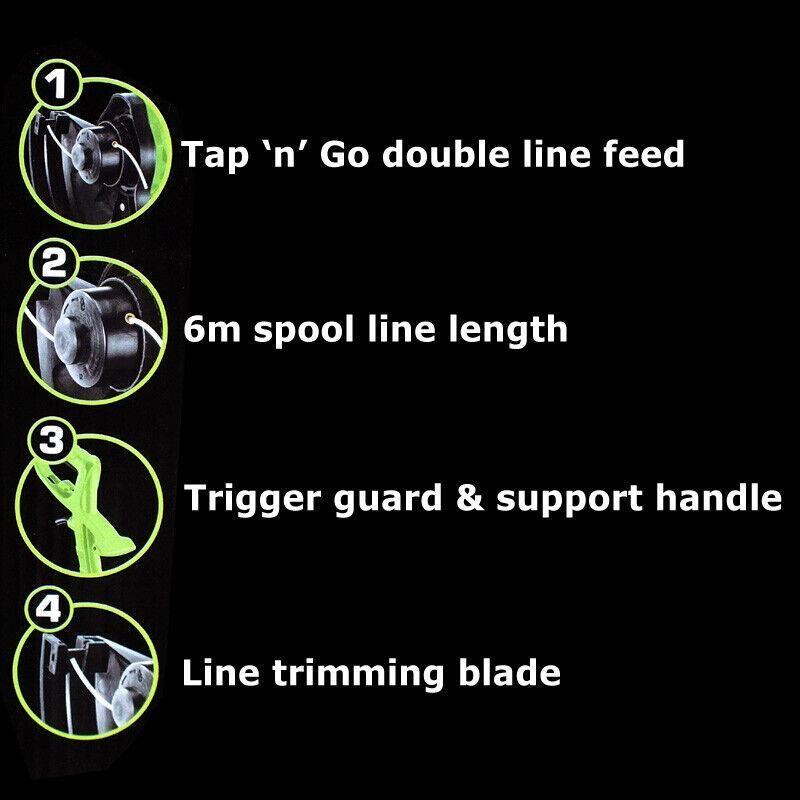 Trimmer with 250W motor and double line - tap'n'go feed system. Fitted with trigger guard, support handle and line cutter...