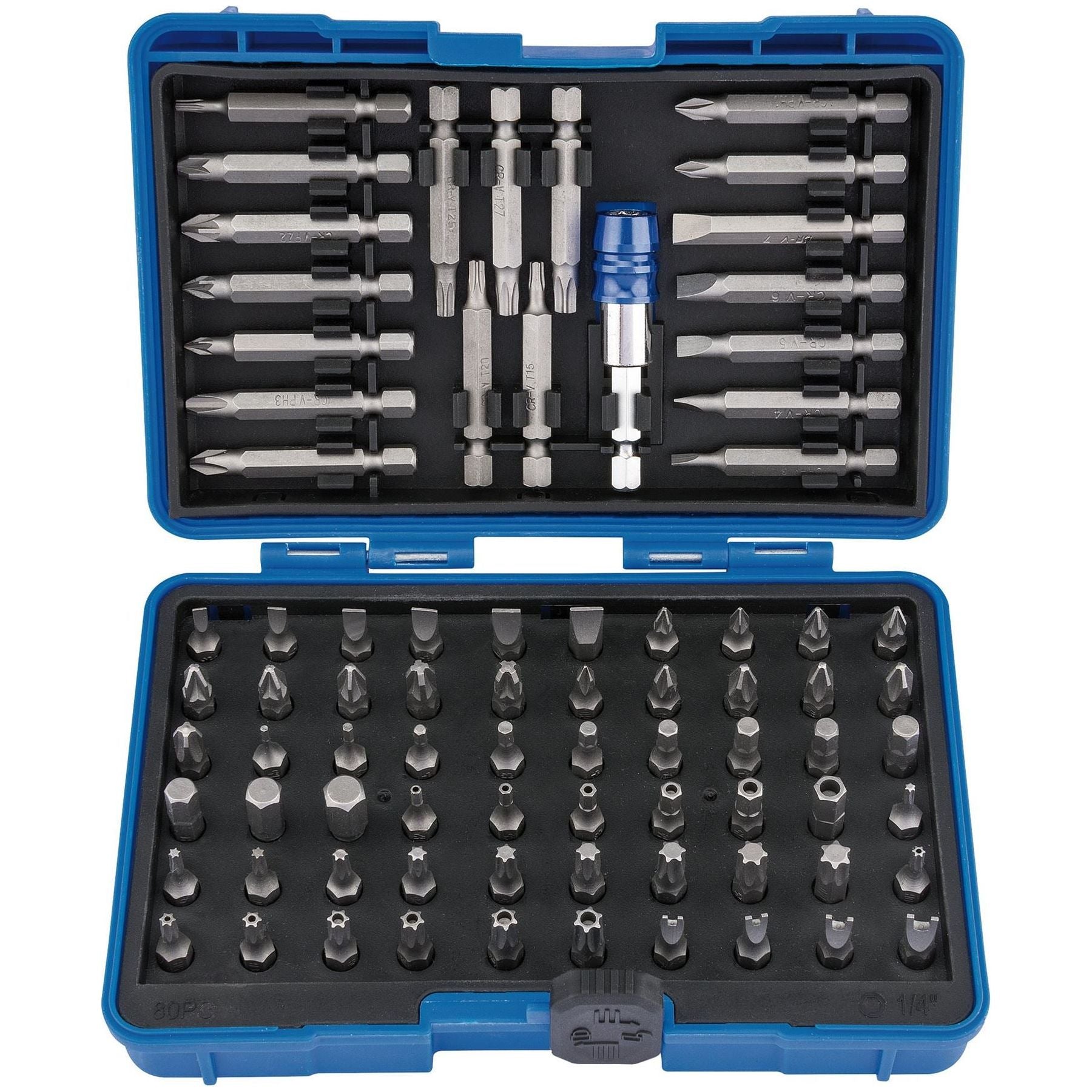 25mm and 50mm 1/4" bits manufactured from chrome vanadium steel, hardened and tempered with a sand blasted finish. Bit holder with quick release collet allows bits to be expelled quickly and efficiently. Supplied in plastic storage case with plastic inlay to hold the bits securely. Display packed.