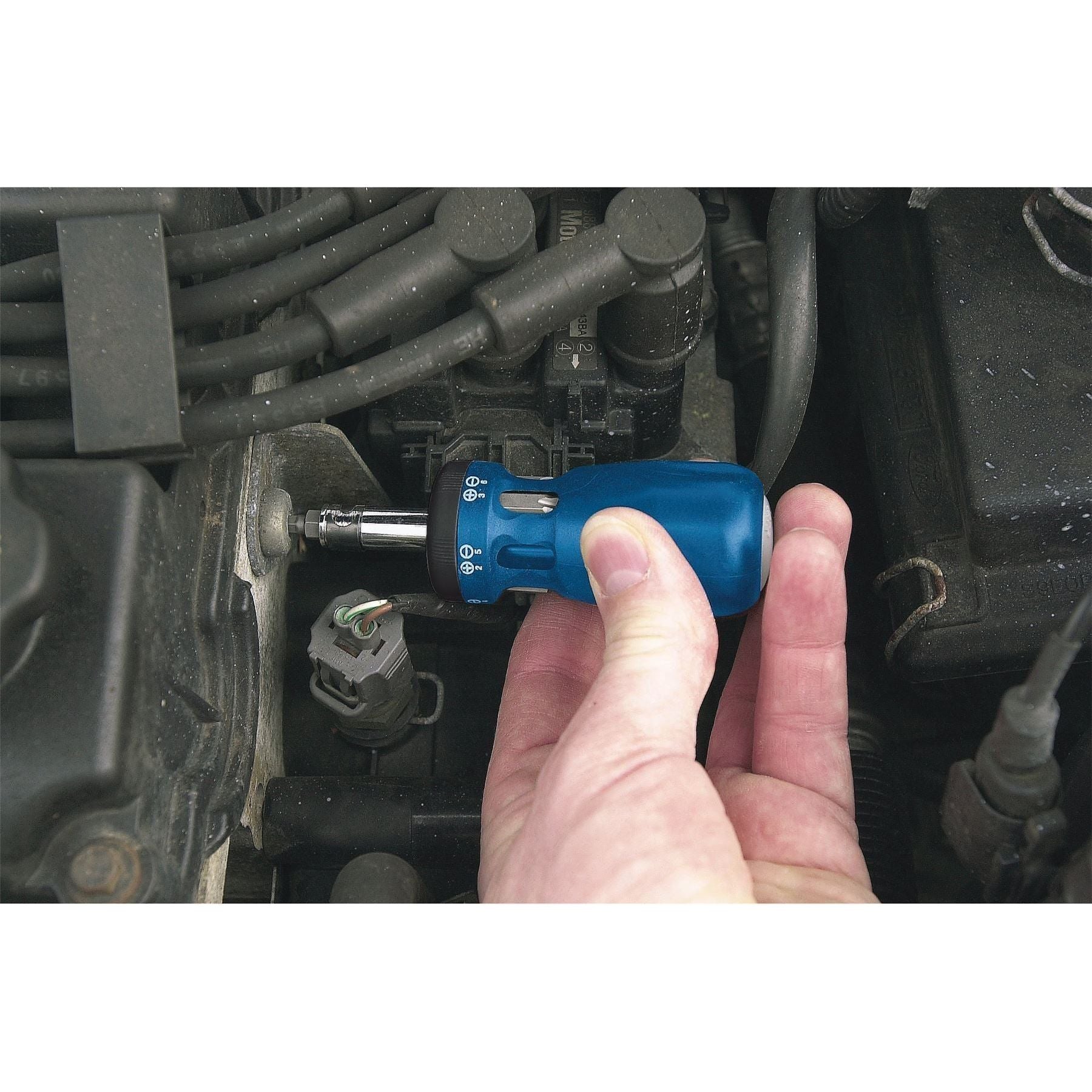 Stubby ratchet screwdriver with ABS handle. Complete with 12 screwdriver bits - arranged as six double-ended insert bits stored in... Read more