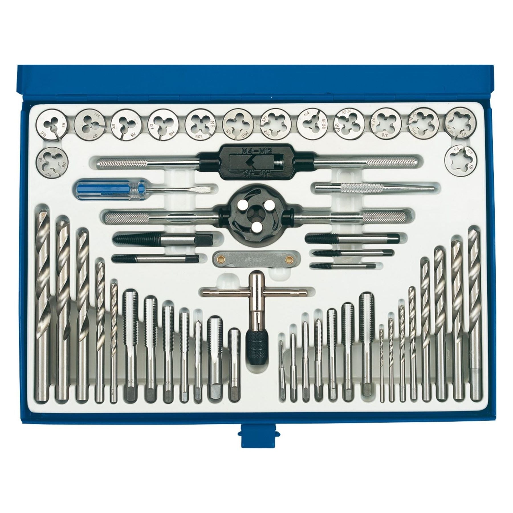 Manufactured from carbon steel. Taps and dies suitable for cleaning and cutting threads on mild steel and aluminium. Supplied with the correct drill bits for tapping. Contents held in plastic insert within steel storage case. Carton packed.