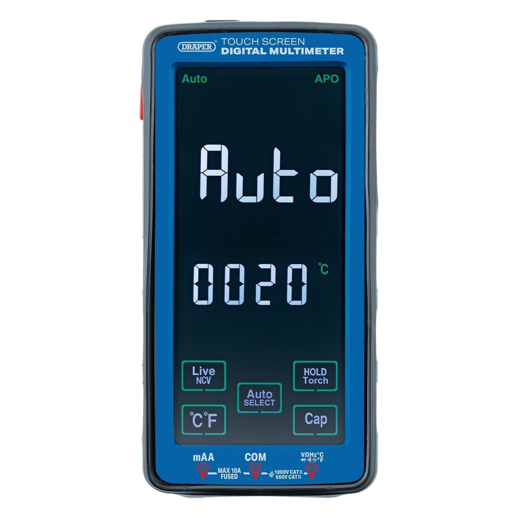 This digital multimeter has a large easy-to-read LCD touch screen with analogue bar display. The device is auto-ranging measuring AC/DC voltage, AC/DC current, continuity, resistance, capacitance, frequency, temperature, diode and non-contact voltage testing. Functionality includes a built-in flashlight, auto power off, continuity buzzer and data hold. Powered by a USB-C rechargeable battery. Includes USB-C charging cable, test leads and temperature probe. Supplied with a durable zip-up case, which incorporates storage for leads.