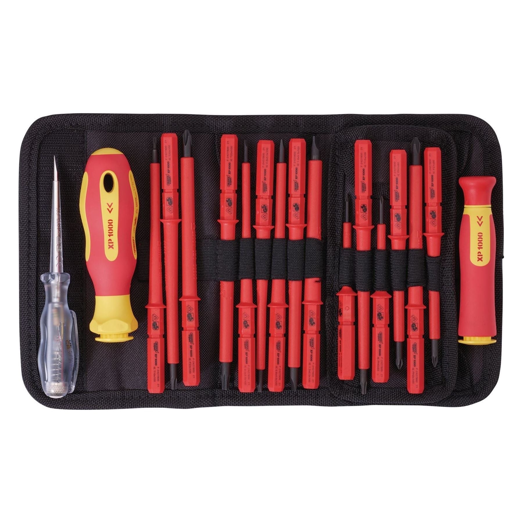 Expert quality XP1000®, interchangeable screwdriver set with a comprehensive selection of screwdriver tipped blades for electrical applications. Includes a circuit tester for additional safety and peace of mind. The handle and blade sleeve is moulded in two pieces, enabling the blades to be fitted deep into the handle ensuring there's no "flashover". Ergonomic soft grip bi-material handle allows free spinning in the palm of your hand to quickly tighten screws, but also allows transfer of torque when needed. Individually tested to 10,000V, suitable for working on live circuits of 1,000V AC and 1,500V DC. The VDE interchangeable blades are made from SVCM steel for added strength and deliver a fast and easy press-in auto lock action with a simple release method. An additional precision screwdriver handle and 240V mains tester allow complete versatility with one set. Supplied in a convenient carrier for secure transportation and storage.