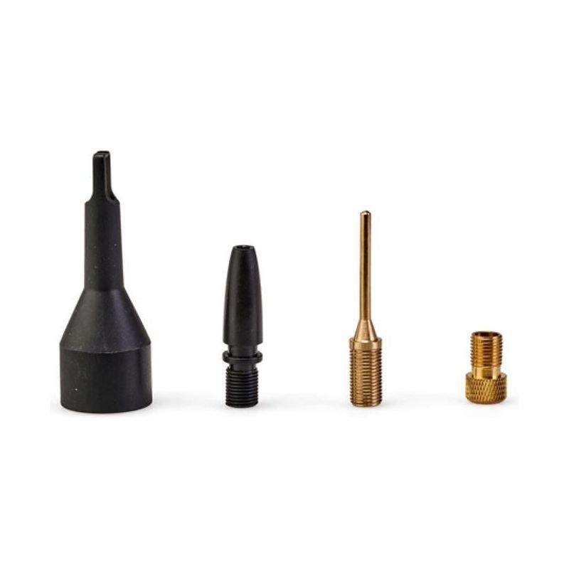 Supplied with a 3 piece adaptor set (ball needle, a tyre adaptor and a conical adaptor). The adaptors are accommodated in the practical, integrated storage compartment in the compressor housing.