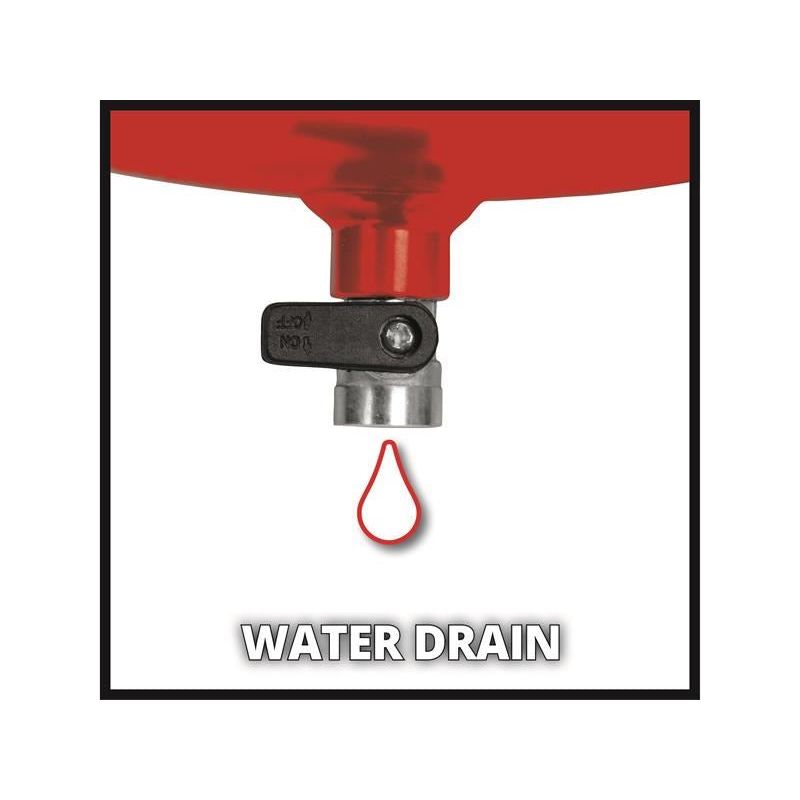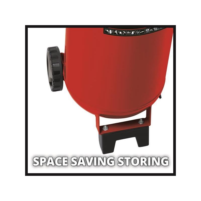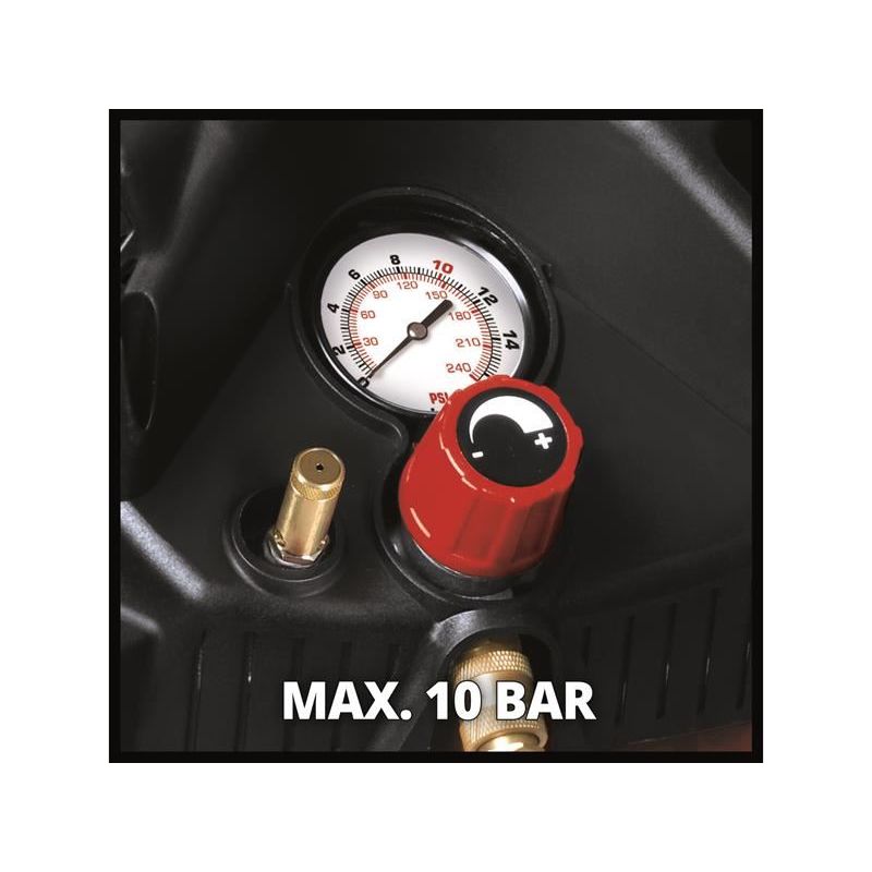 The Einhell TC-AC 240/50/10 OF Air Compressor has a solid, long-lasting 50 litre tank which holds generous reserves for long work sessions. It comes with a 10-year warranty against perforation corrosion of the tank. A pressure reducer provides working pressure adjustment up to 10 bar. Its oil-free pump works without lubrication and therefore requires very little maintenance. This means the compressor can be transported in any position.