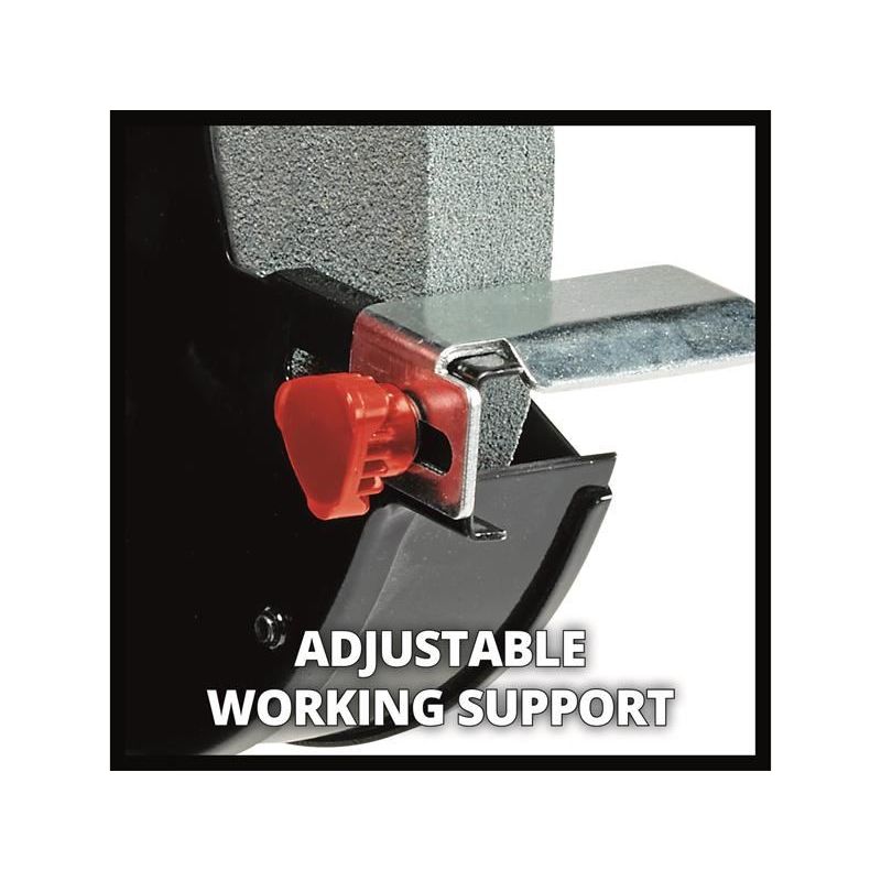 The robust compact metal construction ensures the grinder has a long service life. Large adjustable work supports are a help for a wide range of applications. A ball bearing mounted shaft with zero play makes it possible to achieve precise results. For safety there are spark guard windows which can be adjusted without any tools, plus guard hoods which are closed at the sides. Four rubber feet absorb vibrations and ensure a secure and steady standing position in operation.