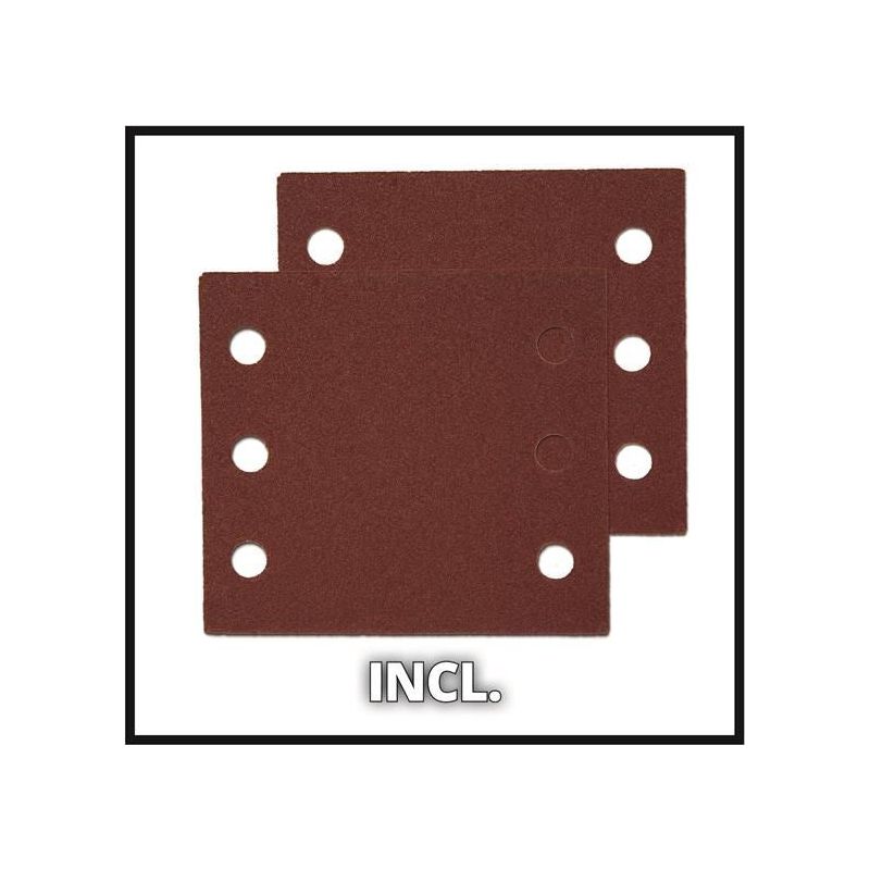 Supplied with an already mounted sanding plate (101 x 113mm) and 2 x Sandpaper (P120).