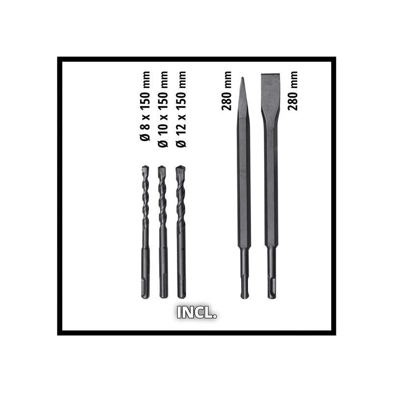 Supplied with three drills (Ø 8, 10, 12mm) as well as pointed and flat chisels is in the transport and storage case E-Box.