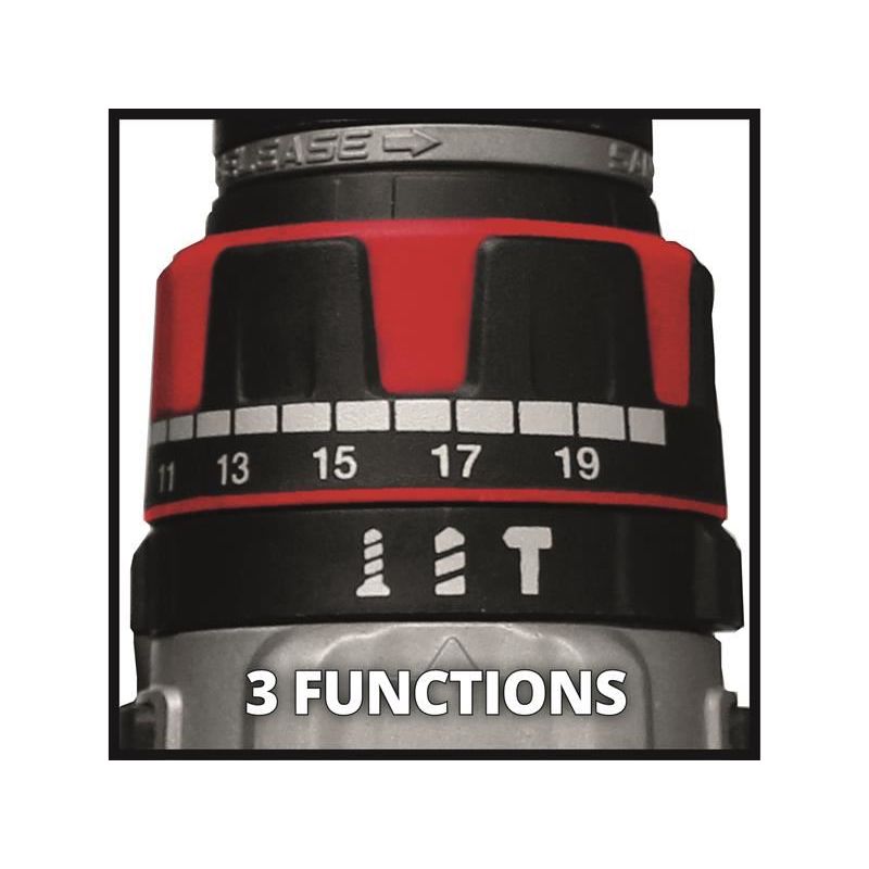 The Einhell TP-CD 18/80 Li-i BL Power X-Change Combi Drill is powered by the Einhell PurePOWER brushless motor. This brushless motor offers more power and a longer running time than conventional carbon brush motors. After registering online, the brushless motor comes with a 10-year warranty. The impact drilling function is very useful when working with difficult materials such as stone or concrete.