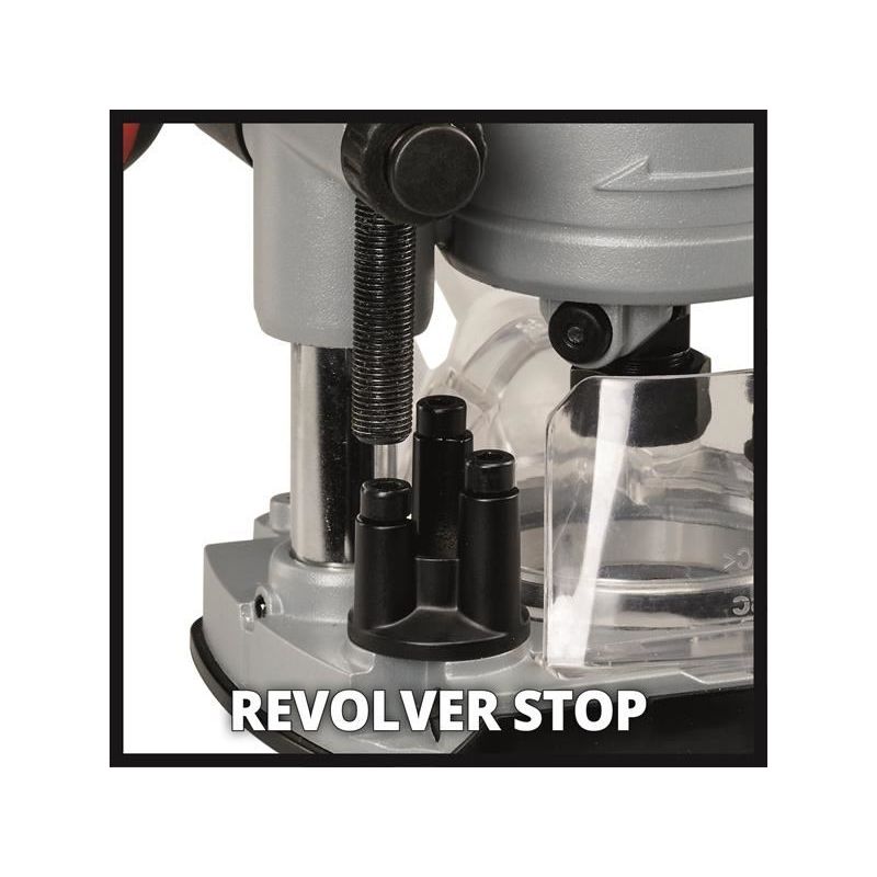 The cutting depth can be infinitely adjusted and features an additional fine adjustment. Depth adjustment is performed with a multi-setting turret stop. The router is equipped with a precise twin-tube guide, a clamp (6mm and 8mm), and a spindle lock for easy tool changes. The LED light ensures the working area is perfectly illuminated. A plastic insert protects the surface of the workpiece.