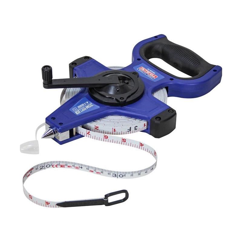 The Faithfull Fast Rewind Open Long Tape features a 13mm wide Class III blade that is clearly marked in both imperial and metric measurements. The fibreglass tape is resistant to stretching, scuffs, is impervious to moisture and has a metal end hook. Its large measurement increments are clear and easy to read in almost all weather conditions. The tape is easy to wipe clean after use.
