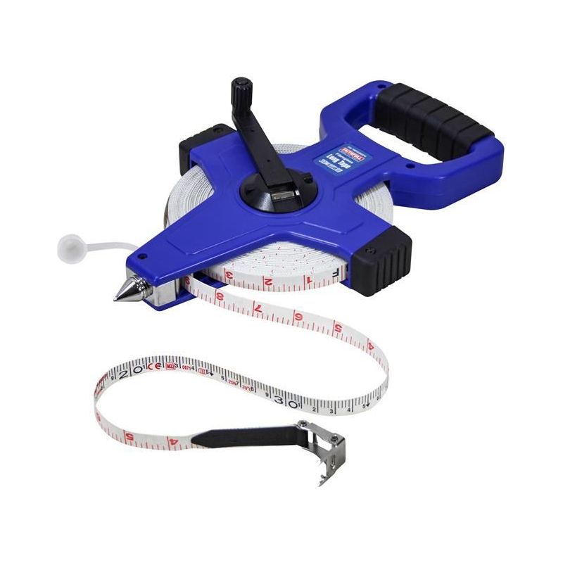 Its large measurement increments are clear to read in almost all weather conditions, and the tape is also easy to clean. The tough ABS open frame case has a fold away rewind handle, a comfortable, sturdy hand grip and an integral metal ground spike making it ideal for single person use. A geared rewind system allows the tape to be rewound back into the case at a fast rate.