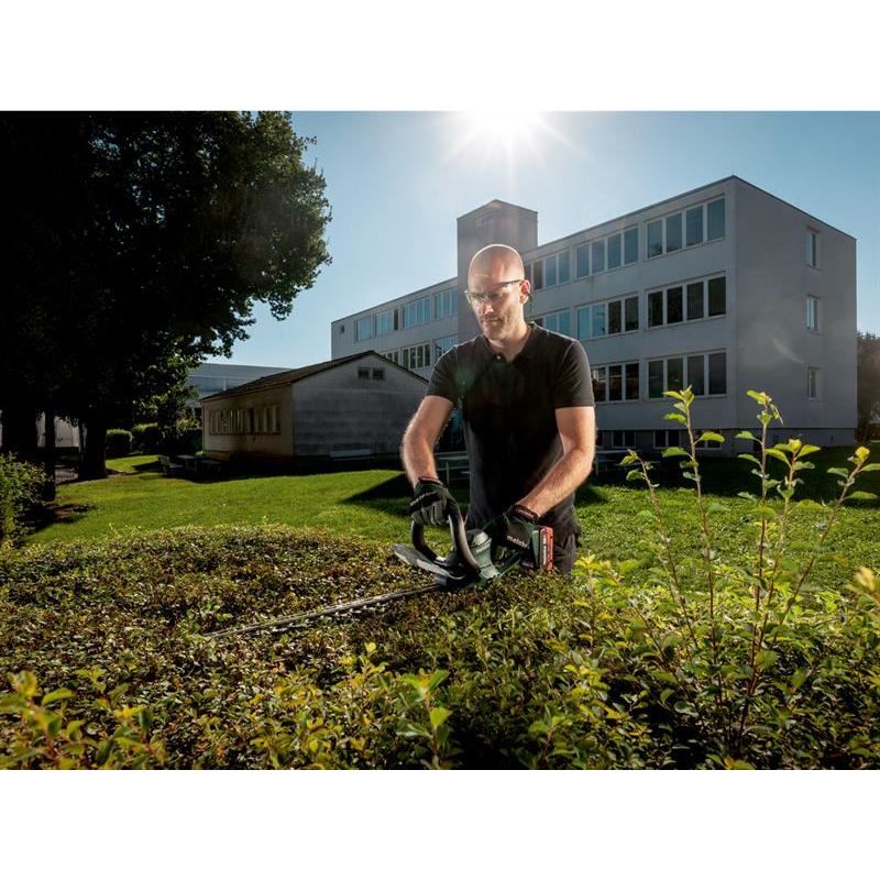 Metabo AHS 18-55 V Hedge Trimmer with special geometry of the blades generating less wear and thus deliver 200% longer service life. Delivers a clean cut thanks to diamond-ground blade teeth on both sides at a 30° angle. Top cutting performance is generated by double reduction gearing.