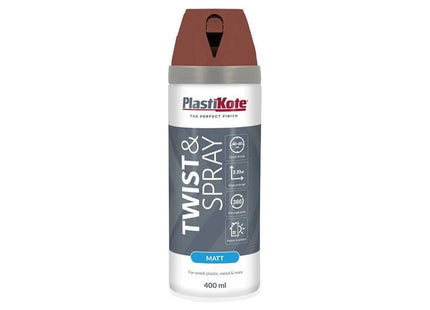 This PlastiKote Twist & Spray Matt 400ml, in Pantile Red, gives an enhanced, consistent coverage. The easy spray technology provides added control to make spray painting easier, faster and cleaner.