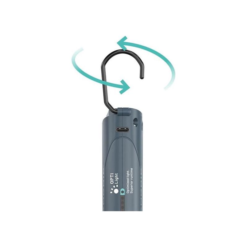 It has a built-in magnet and hook, as well as a flexible 100 % foldable body offering flexible positioning options. The design allows for traditional hand-held use, and its compact size ensures portability anywhere. When folded, it easily transforms into a flashlight that provides a firm grip. In addition, a user-friendly battery indicator keeps you informed about the battery level.