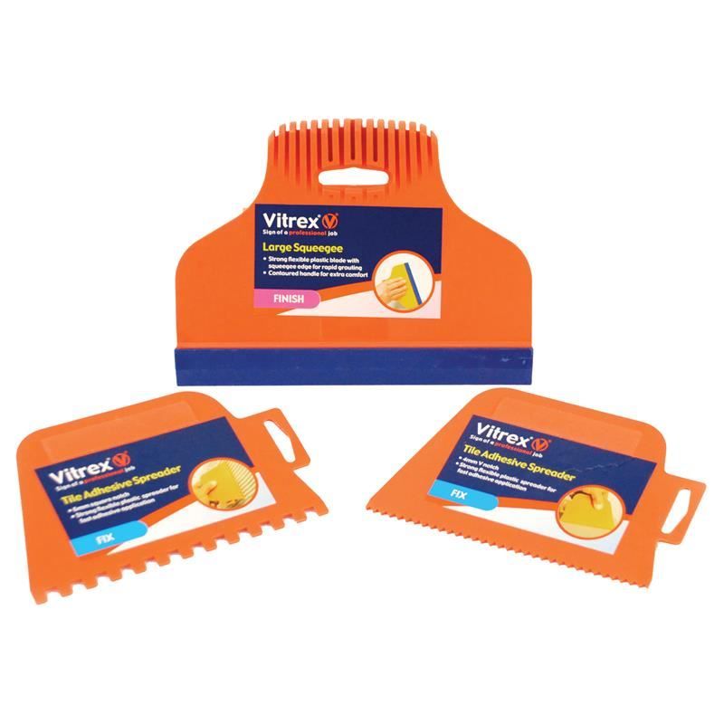 The Grout Squeegee and Spreader Set is a pack of essential tools for tile adhesive and grout application, consisting of a large squeegee, a 6mm square notch tile adhesive spreader and a 4mm V notch spreader.